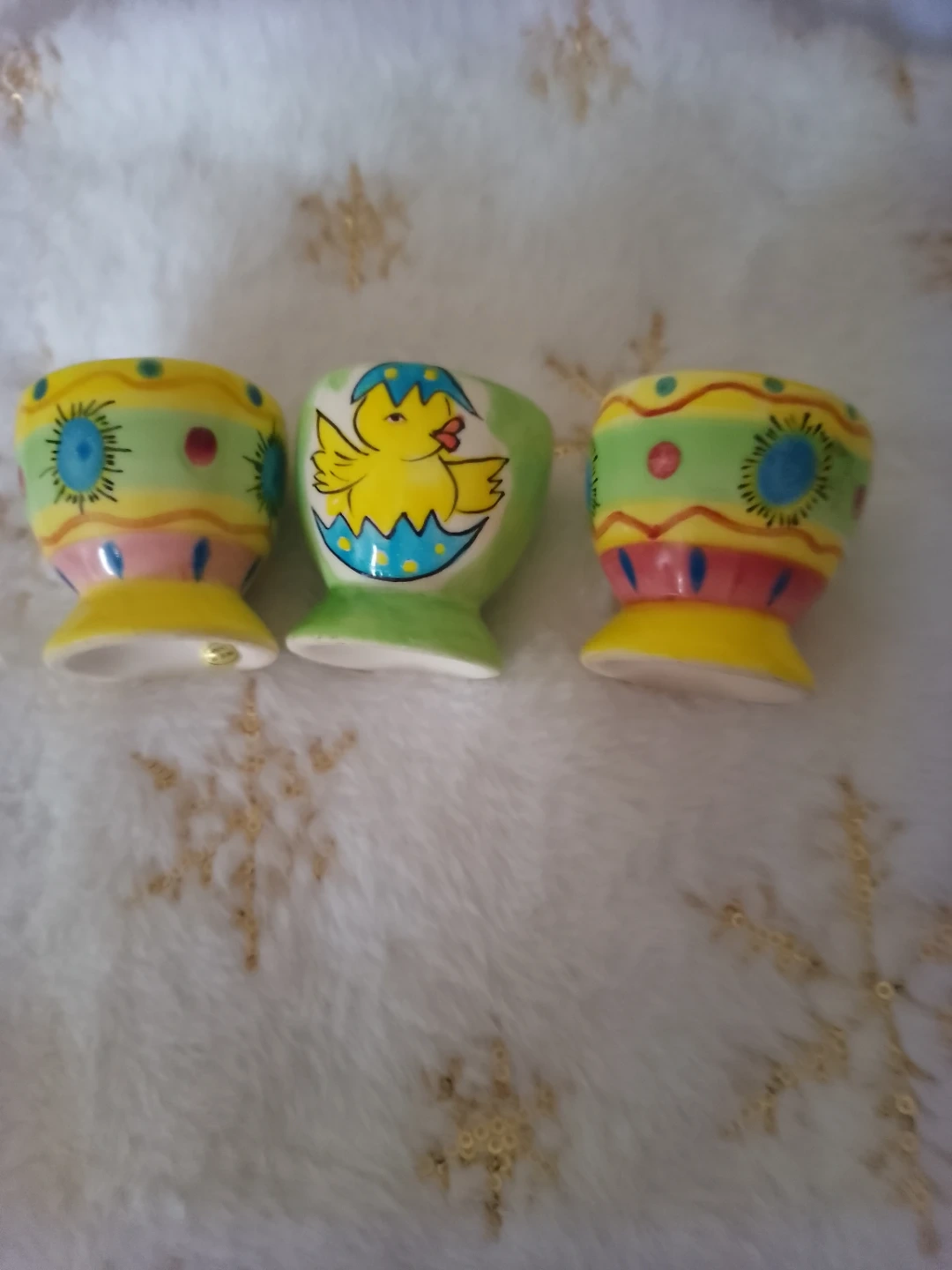 Three ceramic egg cups with fun Easter designs. Features colourful patterns and a chick illustration. These cups are perfect for your Easter brunch table!