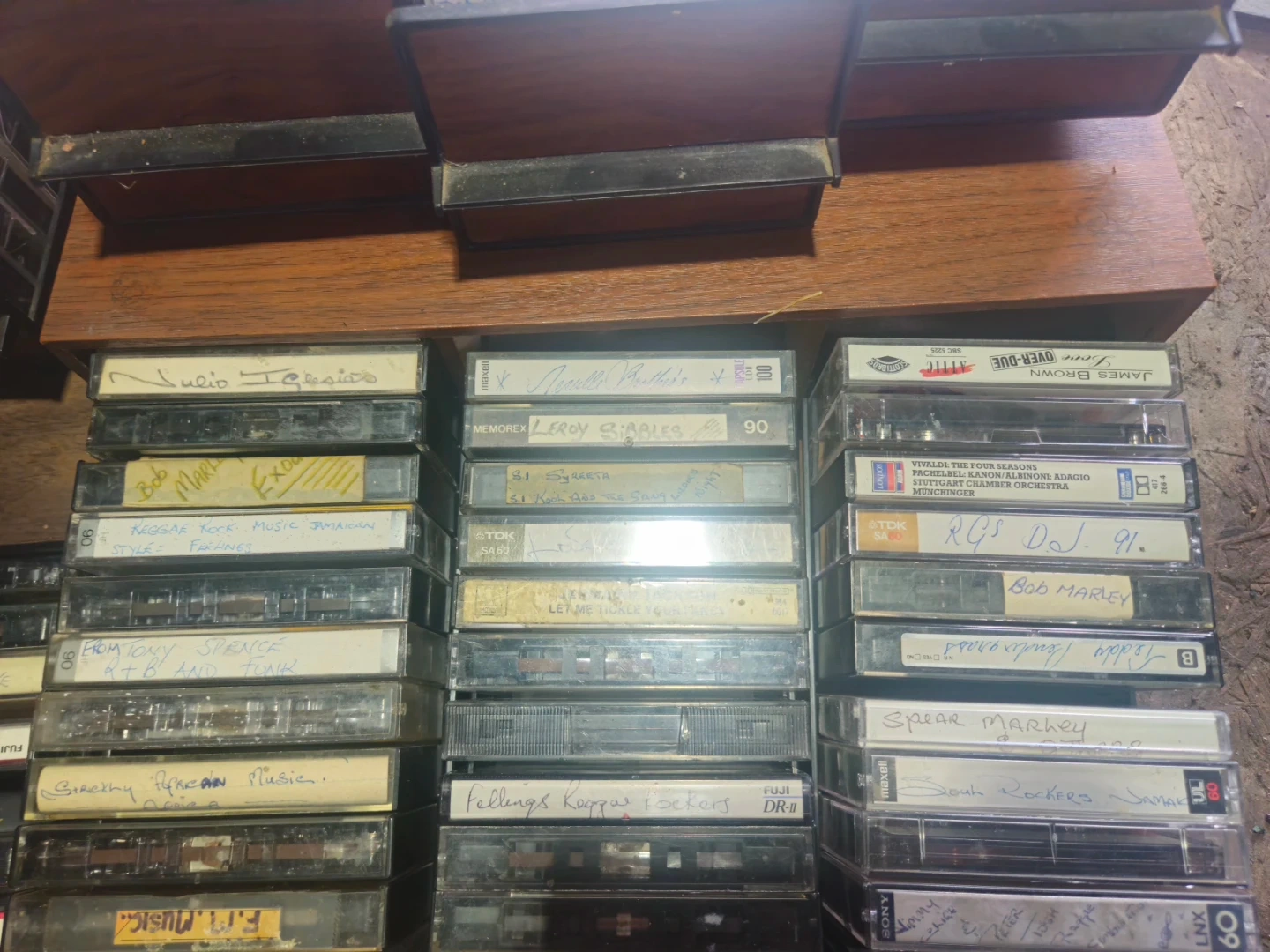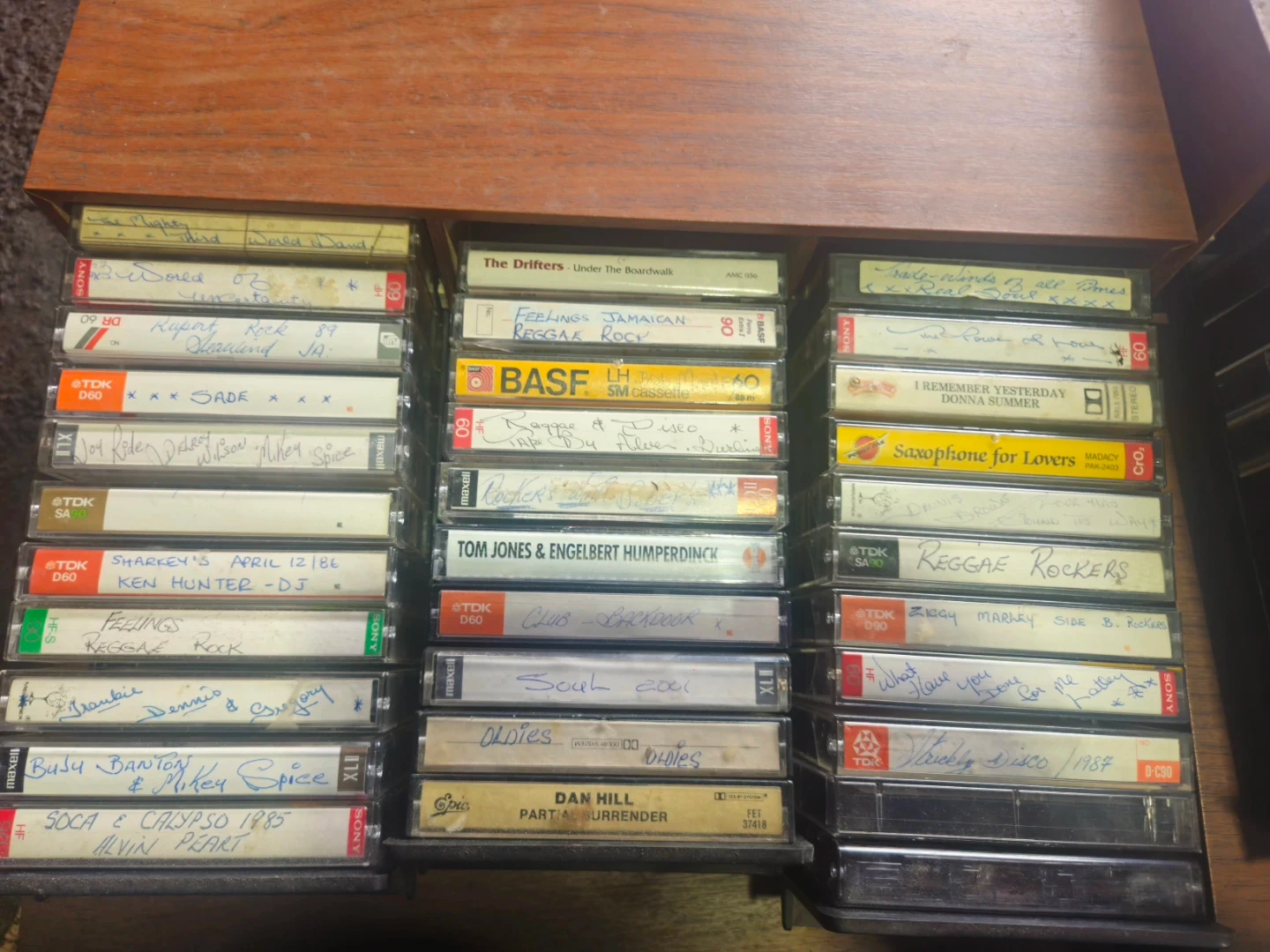 Collection of various audio cassette tapes from brands like TDK, BASF, Memorex, and Maxell. Tapes include a range of artists and genres, many with handwritten labels. Great for collectors or those looking for vintage audio.