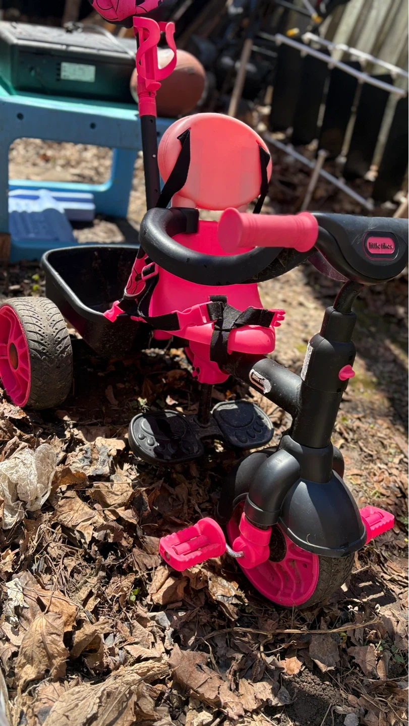 This Little Tikes tricycle is a vibrant pink and black. It's designed for early riders with a secure seat and footrests. The parent handle allows for easy steering and control.