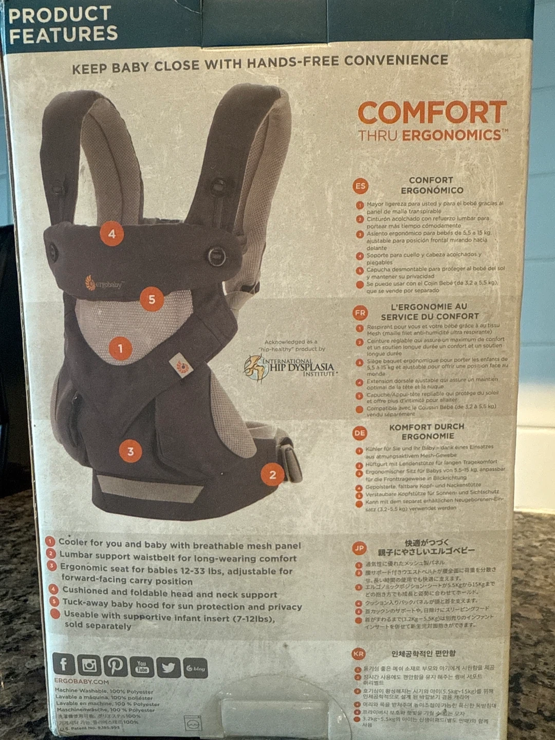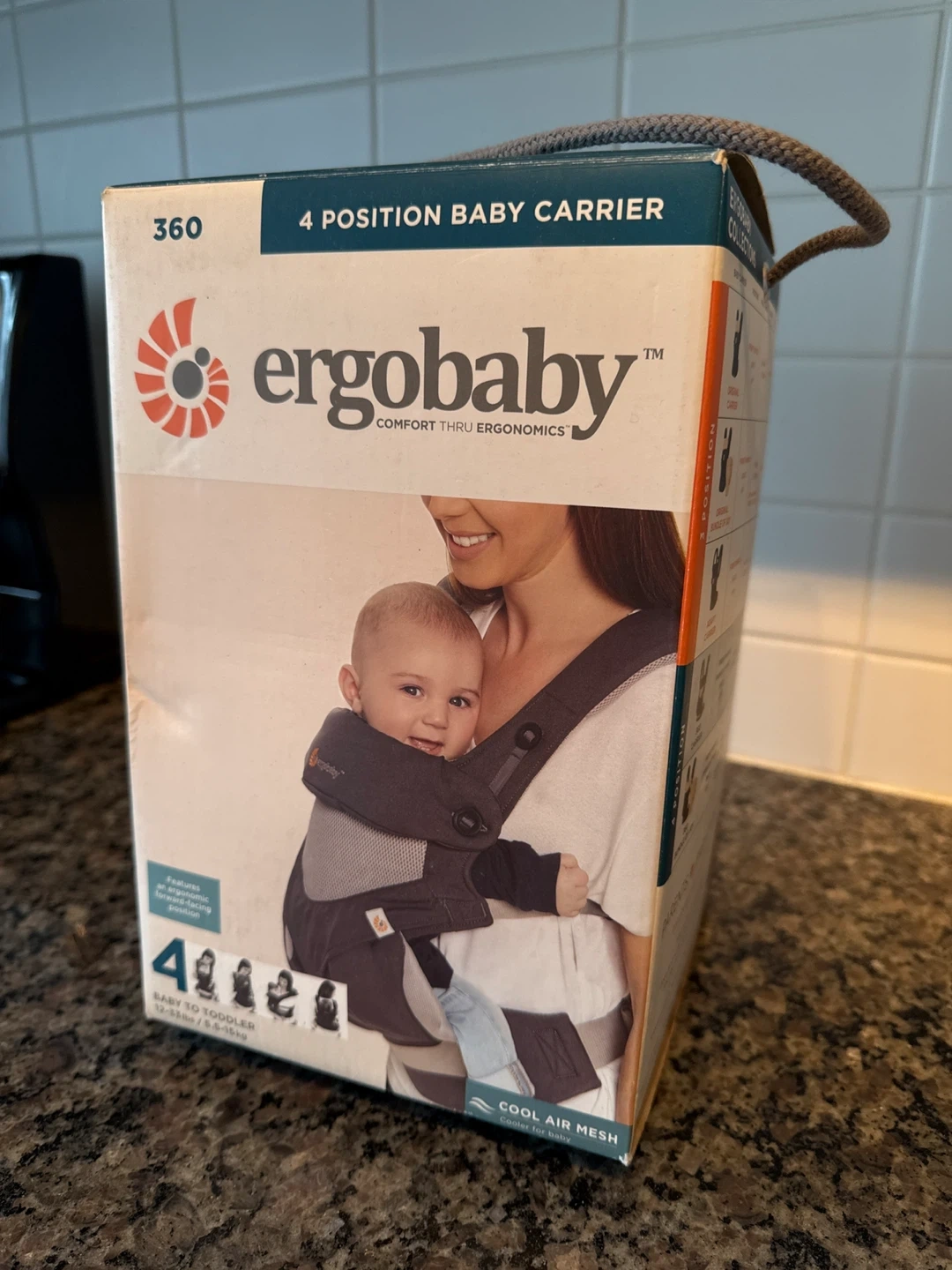 Selling an Ergobaby 360 baby carrier in excellent condition! It's a 4-position carrier designed for comfort through ergonomics. Suitable for babies to toddlers, with a weight range of 12-33lbs (5.5-15kg) or 7-33lbs (3.2-15kg) with infant insert. The carrier features a cooler with breathable mesh, lumbar support, and a foldable hood for sun protection. Comes with the original box!