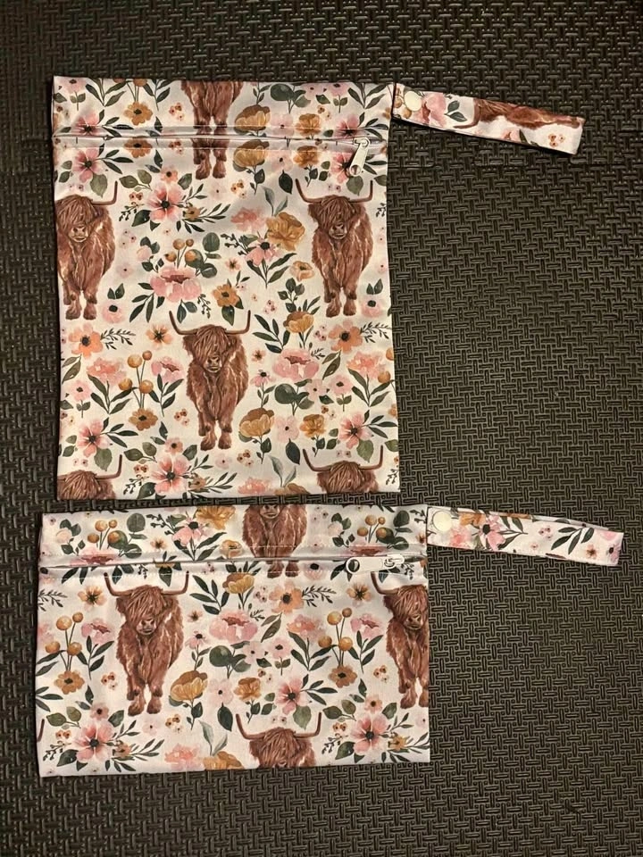 2 floral cow print water resistant bags with handles. $15 for the bigger one and $10 for the smaller one, or take both for $25. Zipper closure. Pickup in Goderich.