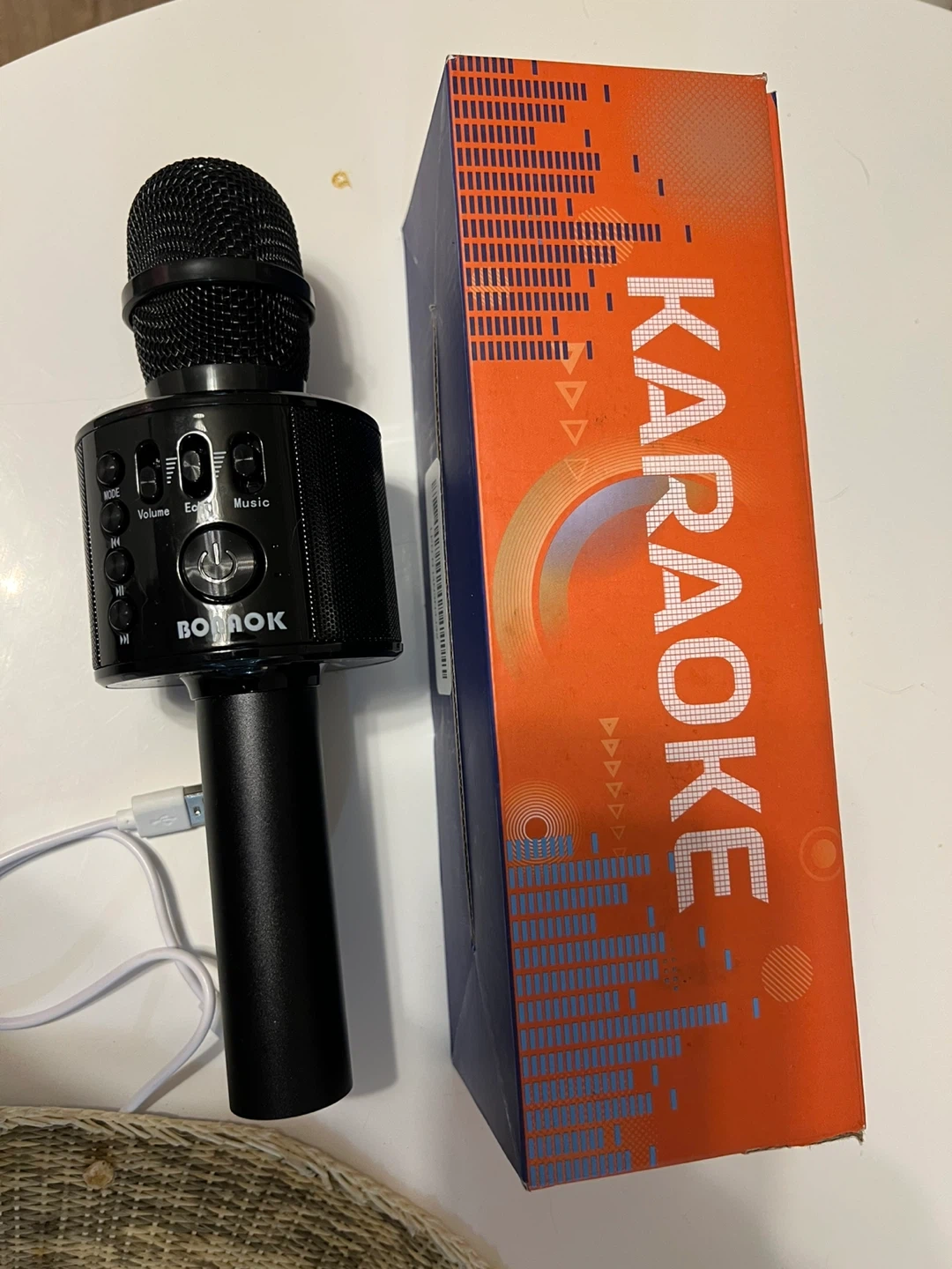 This black BONOK karaoke microphone is portable and comes with its original box. It features volume, echo, and music controls. Great for parties and singalongs!