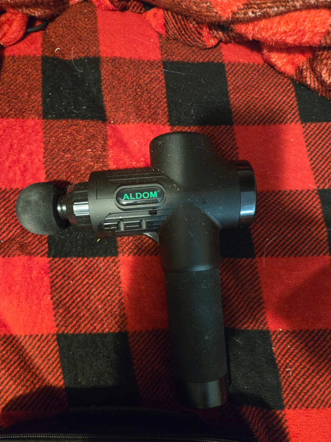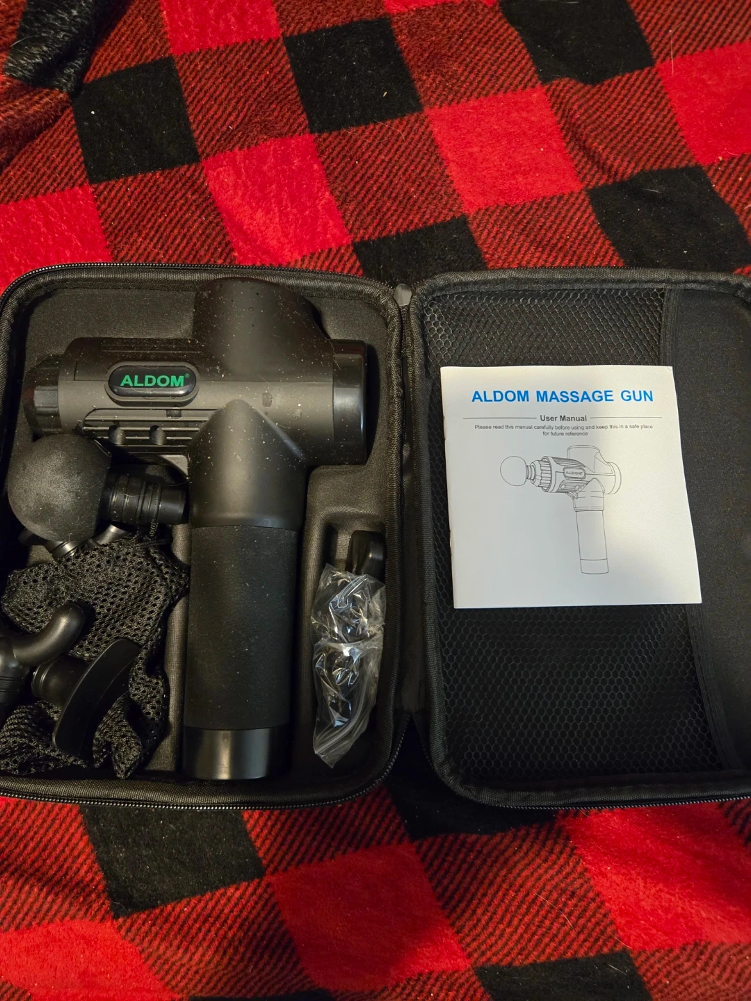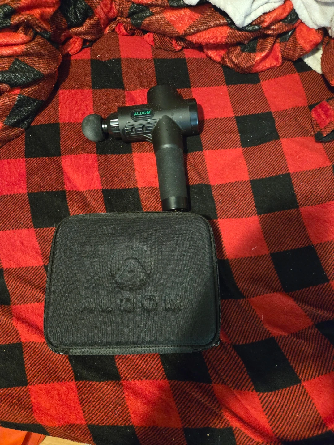 This is an ALDOM brand massage gun, comes with a carrying case and multiple attachments. It's black and has a comfortable grip. Rechargeable battery and user manual included.
