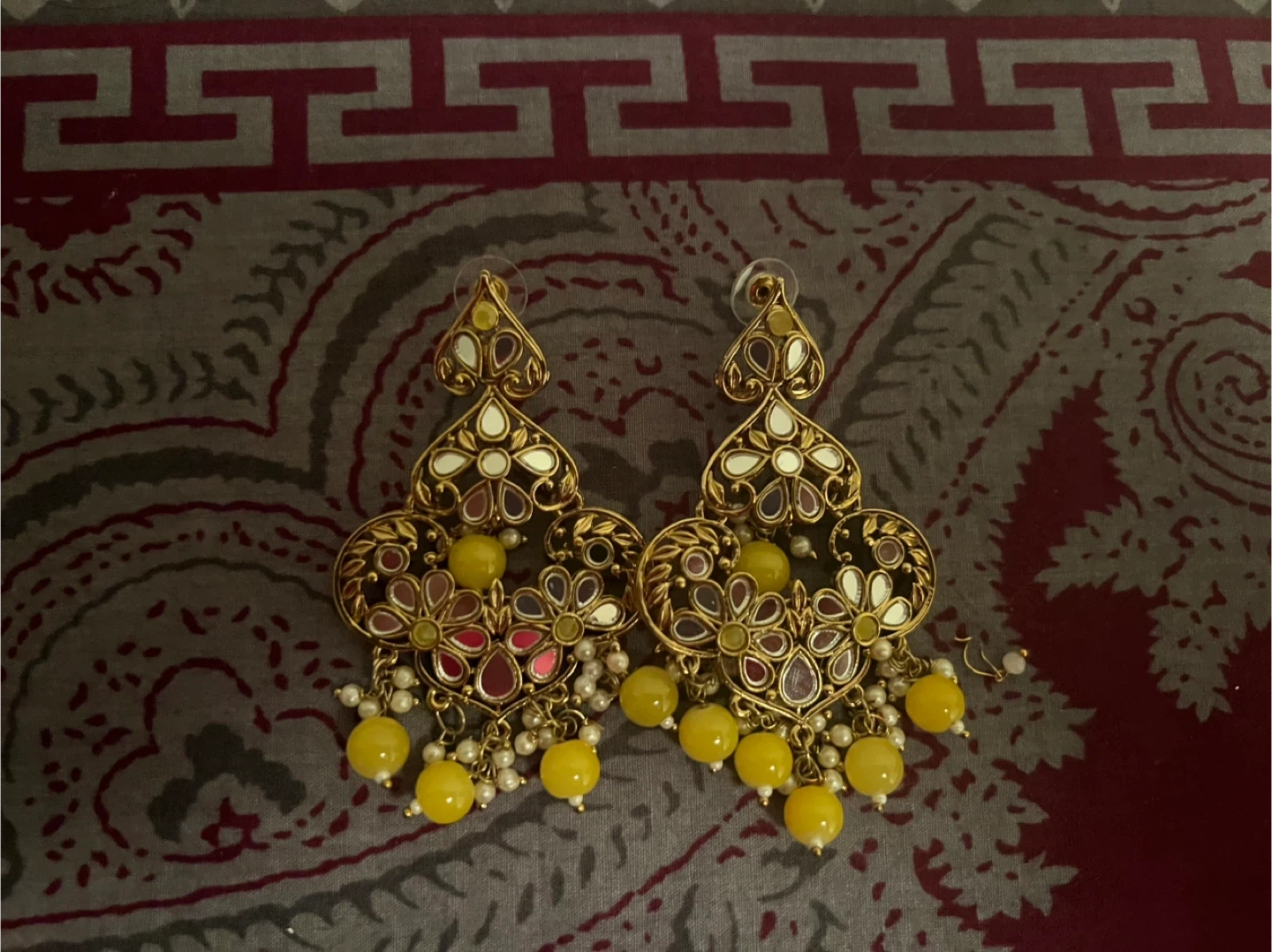 These statement earrings feature a gold-coloured metal base adorned with intricate detailing. They're embellished with small white pearls and bright yellow beads, giving them a vibrant look. They'd be a lovely addition to an evening outfit or for festive occasions!