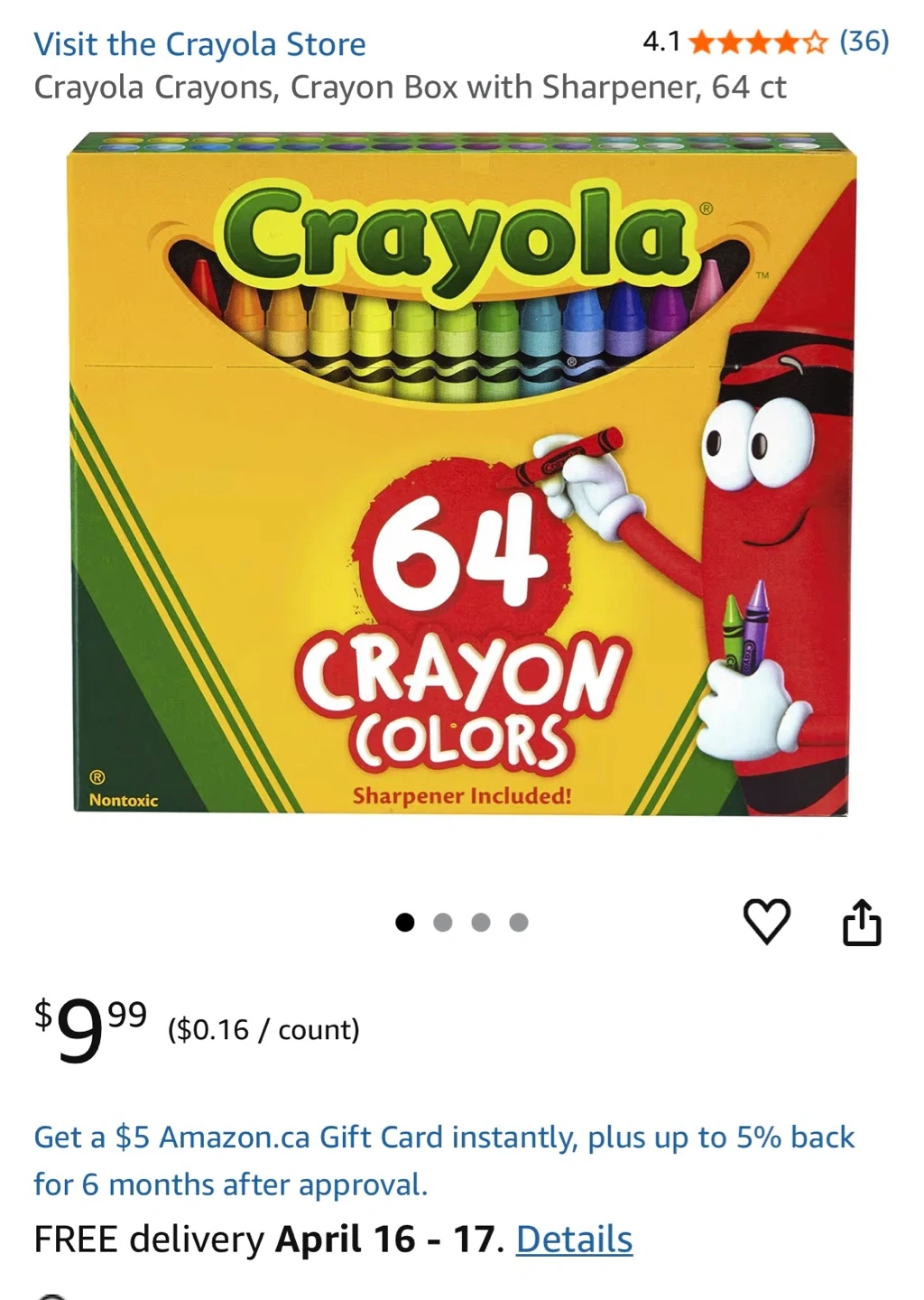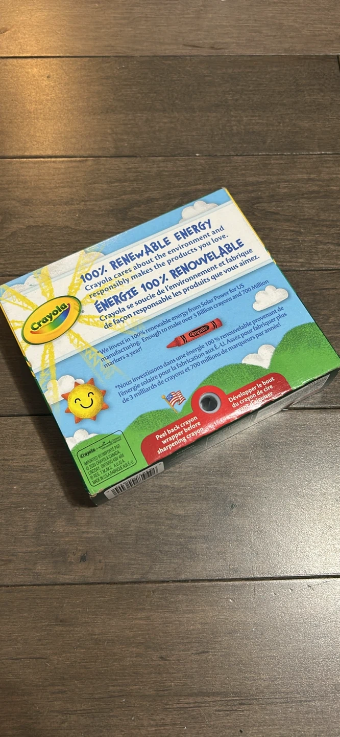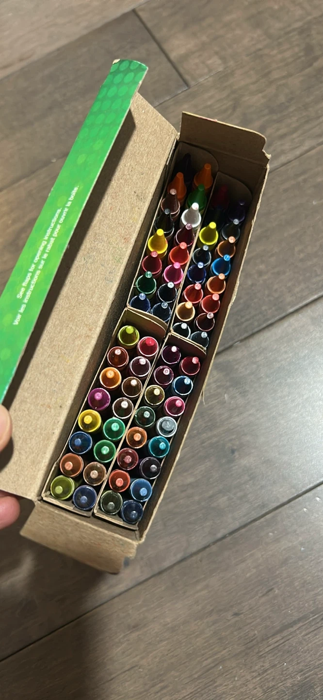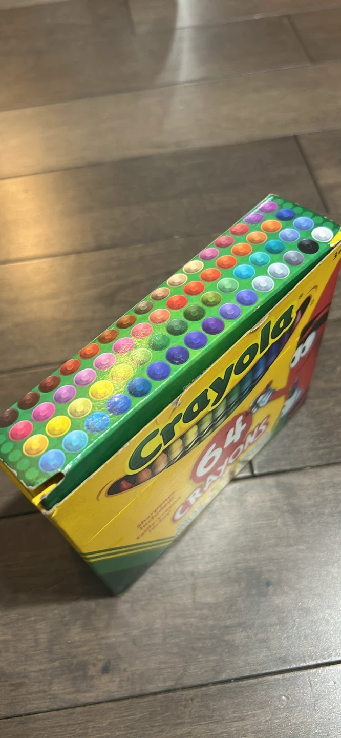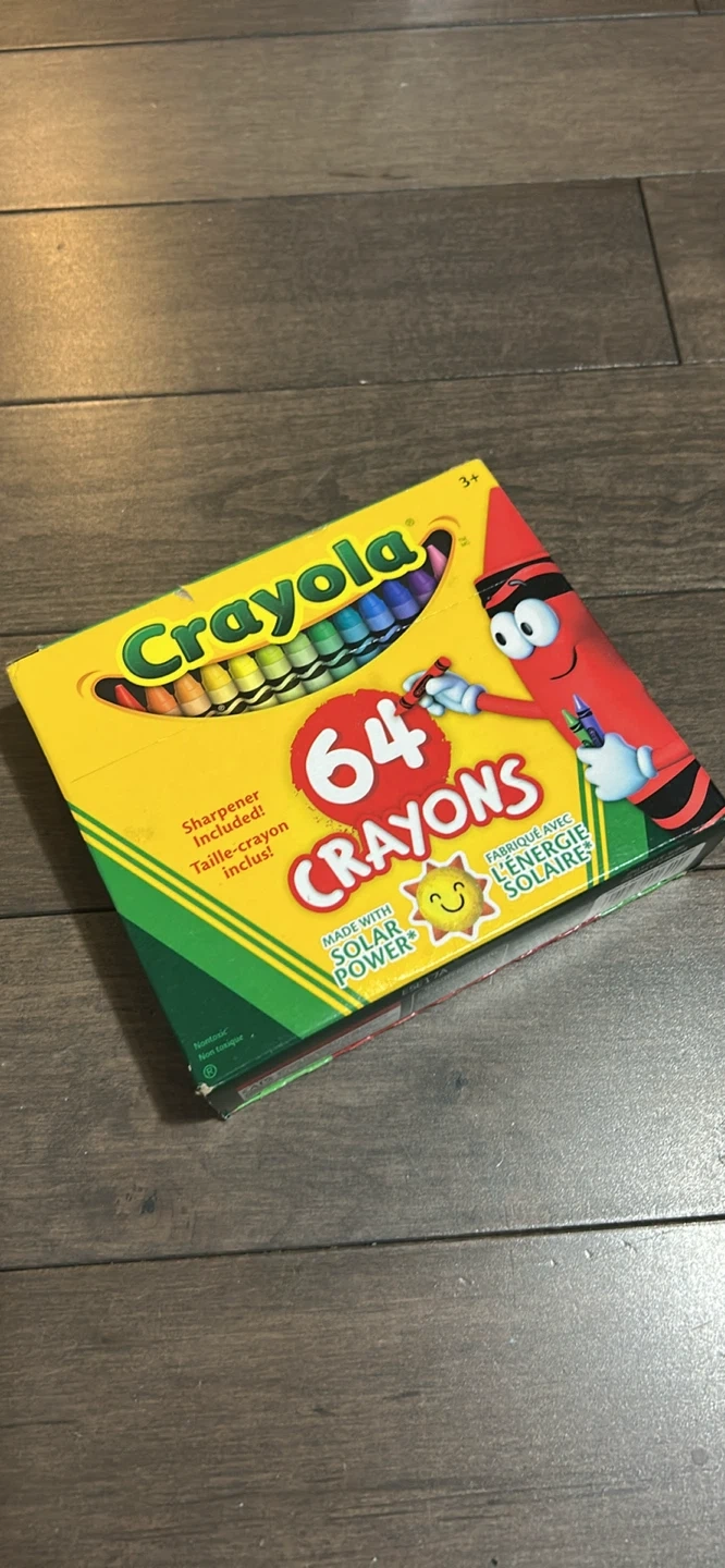 This is a box of 64 Crayola crayons. It includes a sharpener for keeping your crayons in tip-top shape. Non-toxic formula.
