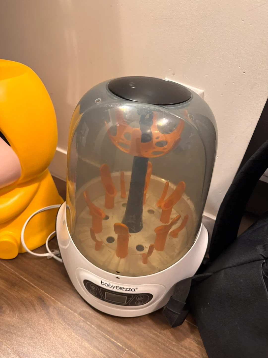 This Baby Brezza sterilizer and dryer effectively cleans and dries baby bottles. It's designed to eliminate germs and ensure bottles are ready for use. Suitable for busy parents needing a quick and hygienic solution for bottle preparation.