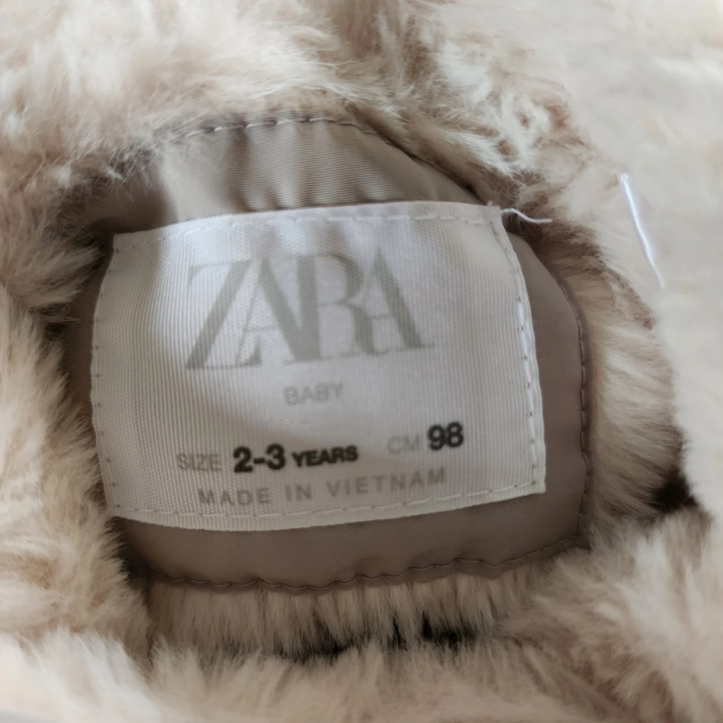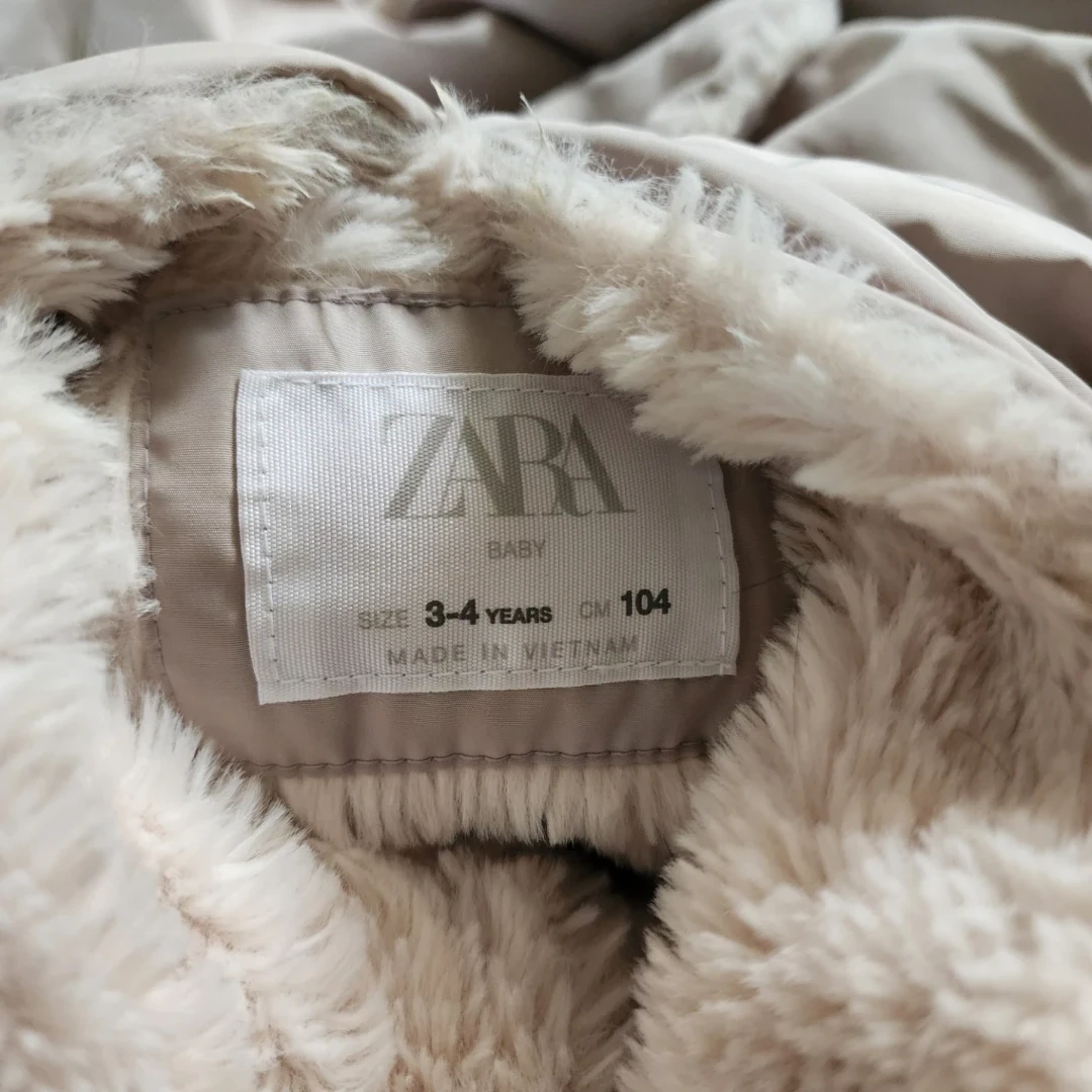 Two Zara baby winter jackets with cozy faux fur lining. One is size 2-3 years (CM 98) and the other is size 3-4 years (CM 104). Both are light beige with hoods and front pockets.