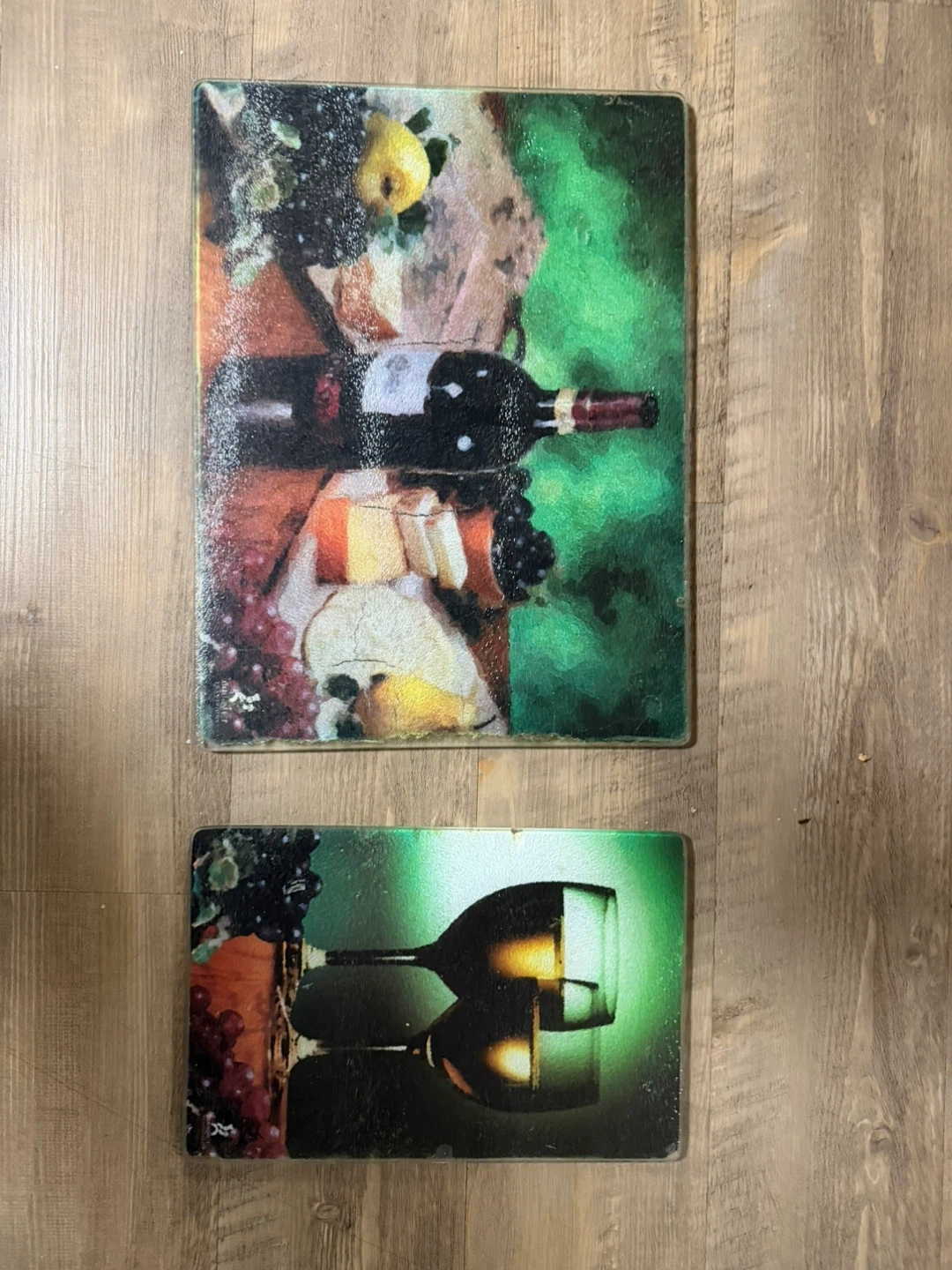 This set includes two glass cutting boards, one larger and one smaller. Both feature colourful wine and cheese themed designs. They're made of glass and have rubber feet for stability.