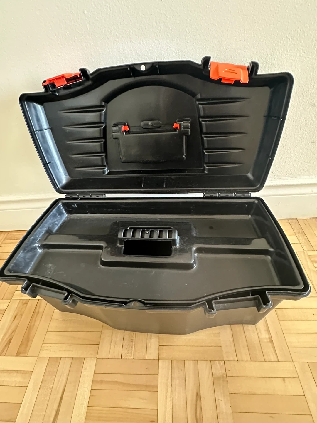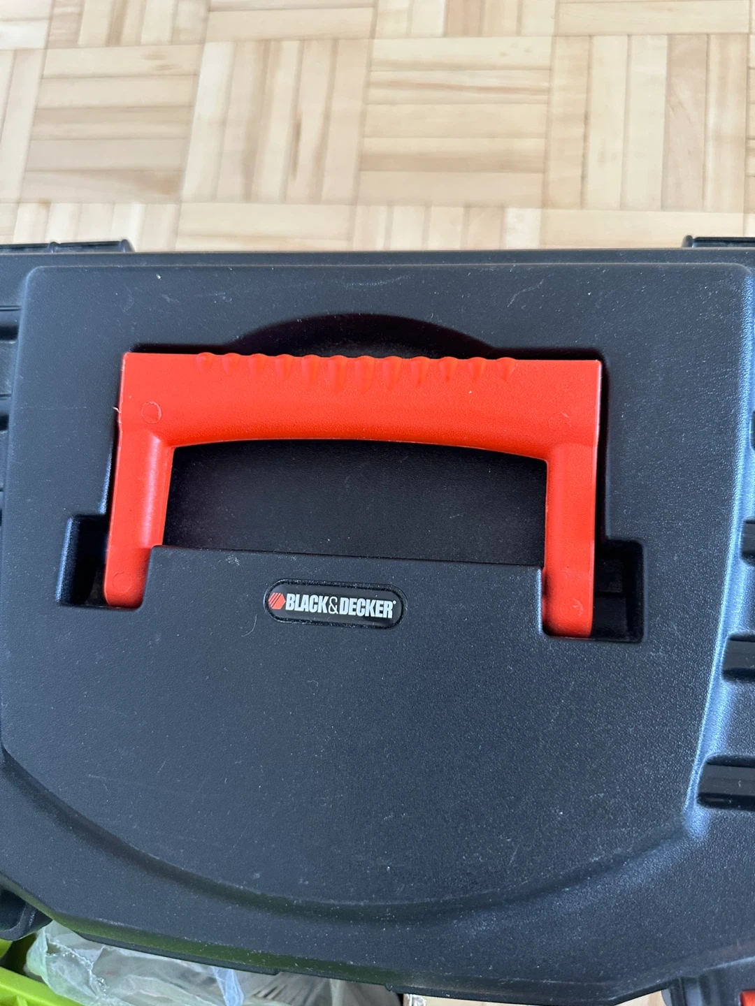 This is a black plastic tool box by Black & Decker. It has orange latches and a bright orange handle. The lid has compartments for organizing smaller items.