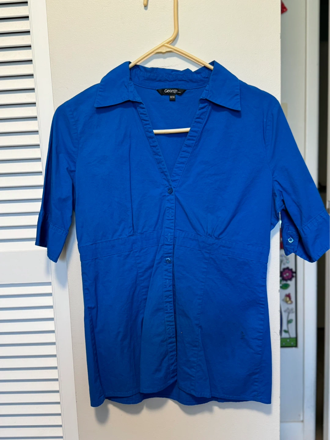 This is a George brand women's button-up shirt in a vibrant blue colour. It's a size medium with a flattering fit. The shirt features a classic collar and a button-down front with three-quarter sleeves.