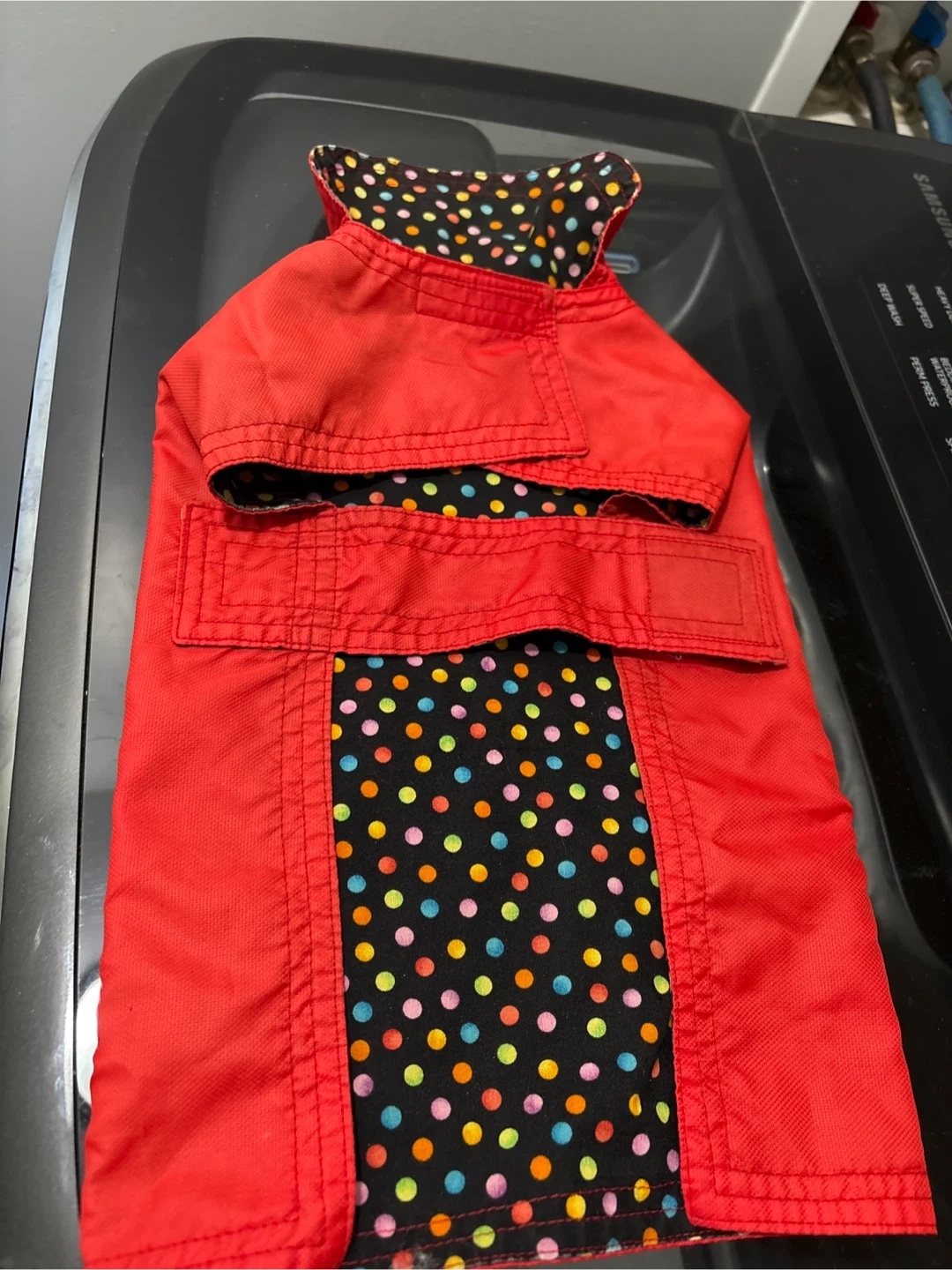 This adorable small dog coat is reversible with a vibrant red & fun black /polka dot pattern. It has a velcro closure for easy on and off. Perfect for keeping your small furry friend dry… and stylish on walks.. *Best for 15–22 pound dog