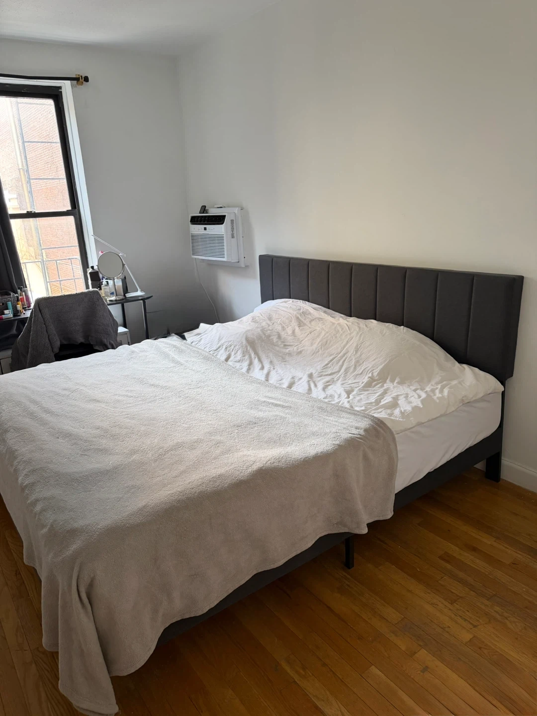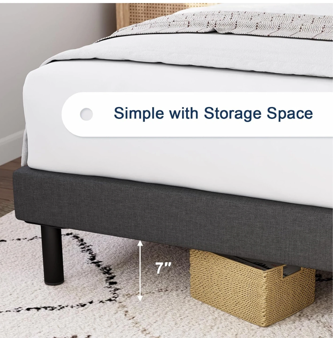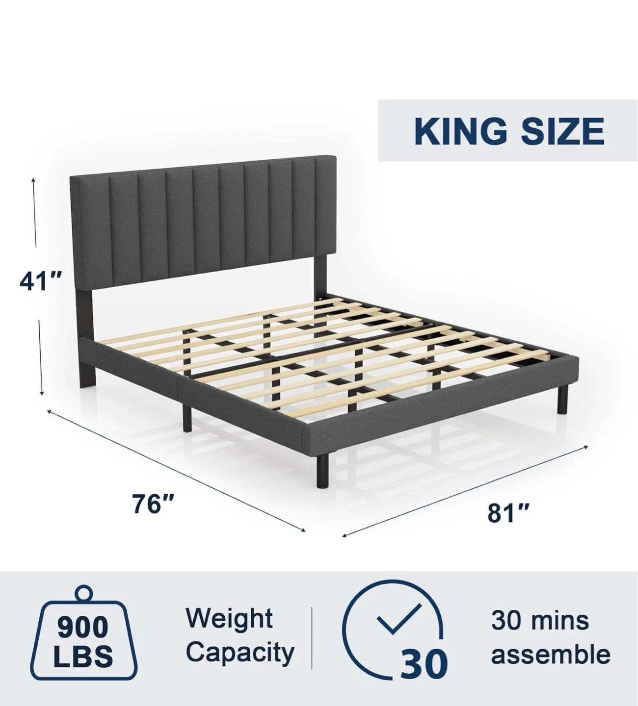 This king size platform bed frame features a dark gray upholstered headboard with a soft touch. It offers 7" of clearance for storage underneath and has a weight capacity of 900 lbs. Assembly takes approximately 30 minutes.