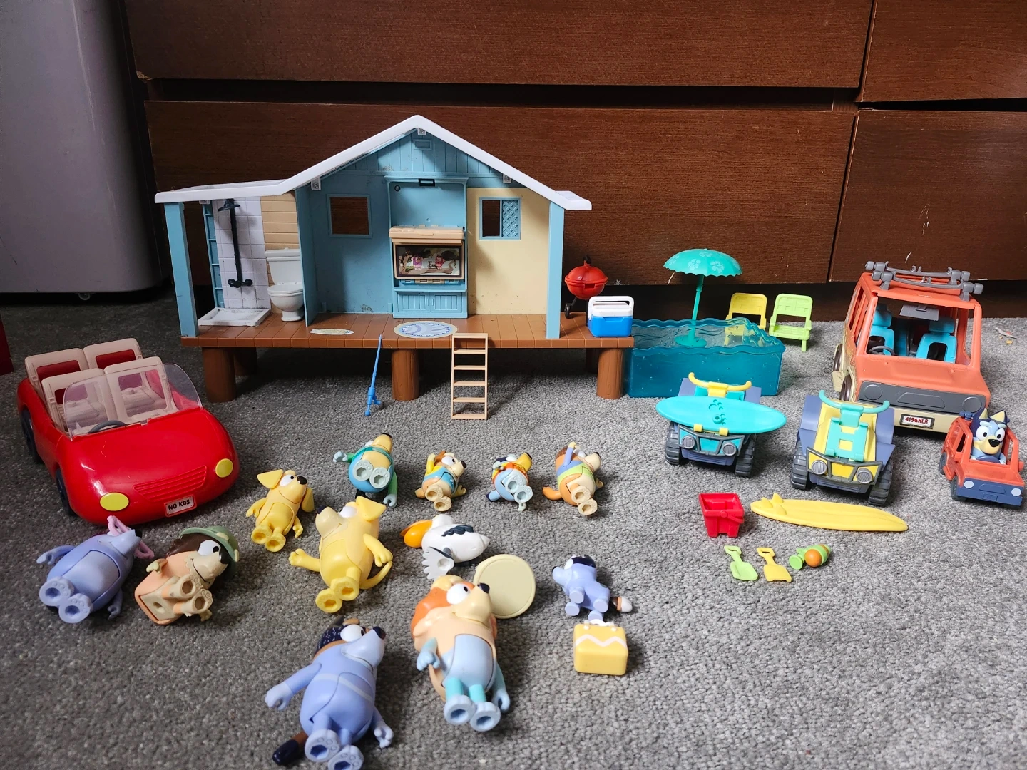 This playset includes the Bluey family, a beach house, pool, and various accessories like chairs, a BBQ, and vehicles. It's perfect for recreating fun beach adventures! All items shown are included.