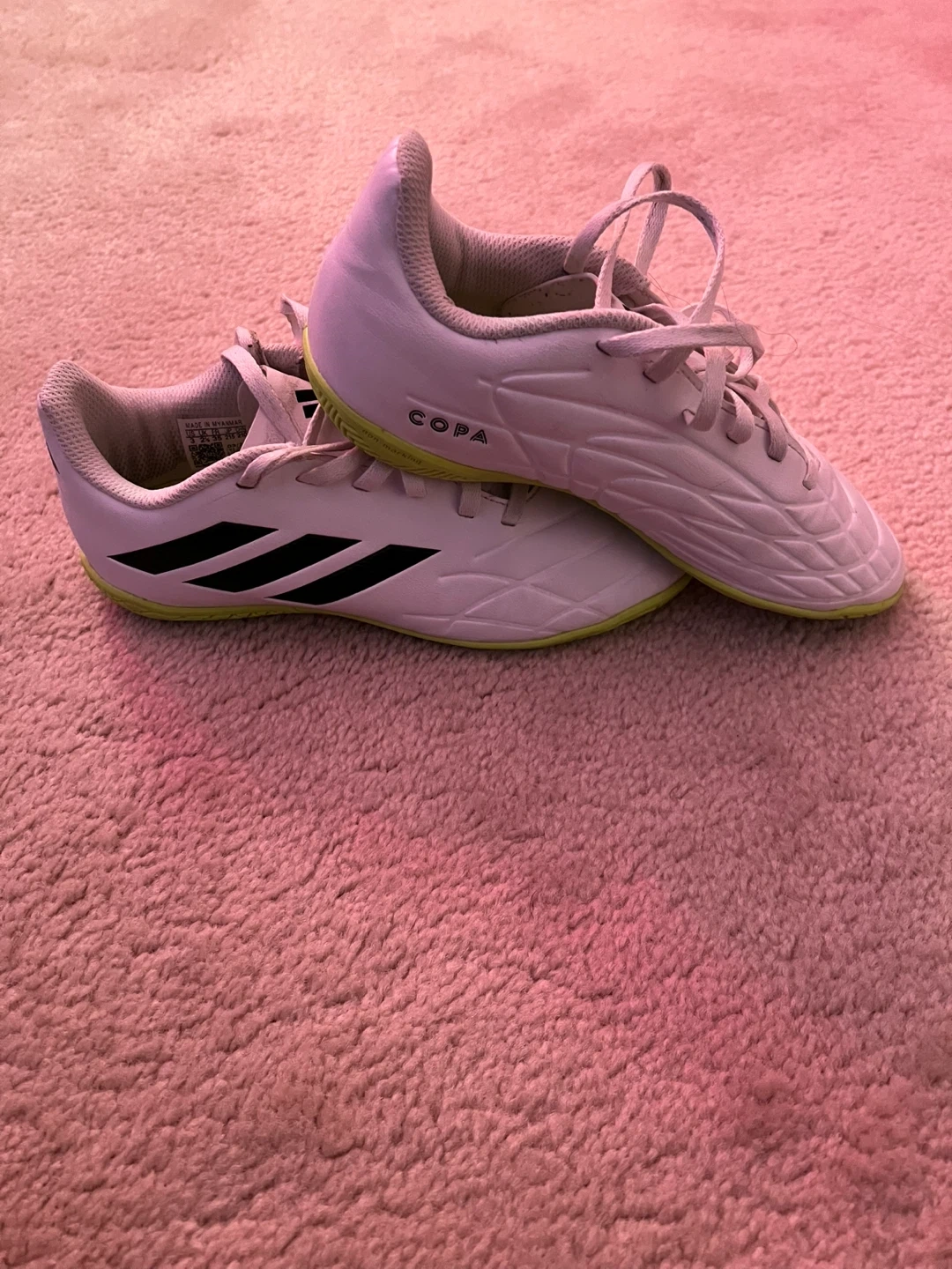 Selling a pair of Adidas Copa indoor soccer shoes. They are a US size 3 youth. These shoes are in great shape and ready for the field!
