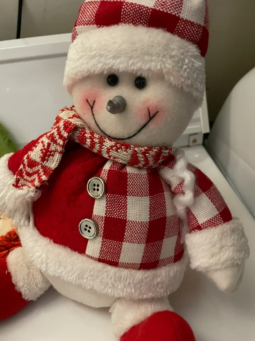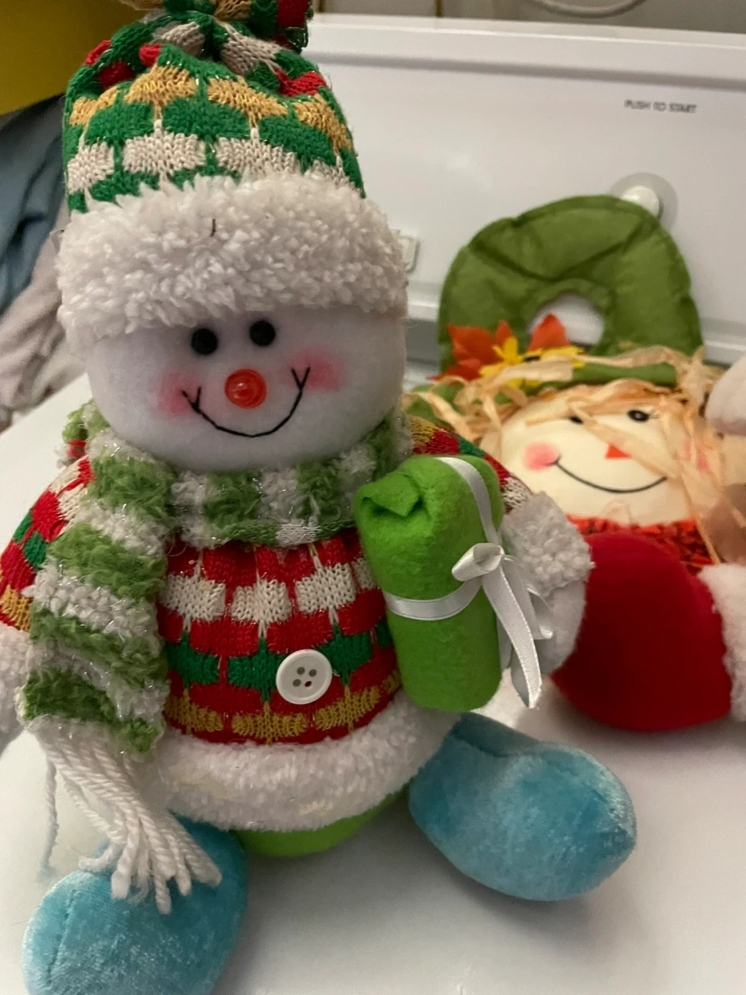 Two festive plush snowman decorations with winter attire. One wears a green and white striped hat and sweater, the other a red and white checkered hat and jacket. Both have fuzzy white trim and scarves. Plus one door hanger scarecrow head! Weighted so they sit price is for all three items