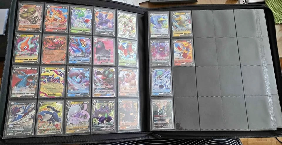 Brand new binder, never used. It has no rings and is side-loading, fitting sleeved cards nicely. It was just a bit too big for what I needed. 20 pockets. Dimensions are 17.7" x 16.5".