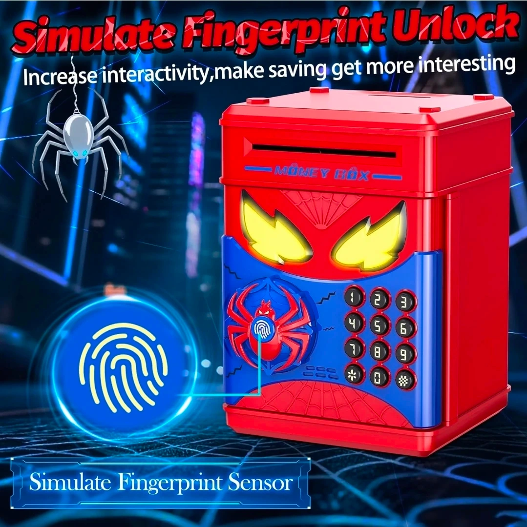 This Spiderman-themed money box features fingerprint simulation and an electronic ATM keypad for secure savings. It's designed with cool eye lighting effects that change colour based on password entry success. Banknotes automatically enter, and it's great for kids aged 3 and up!