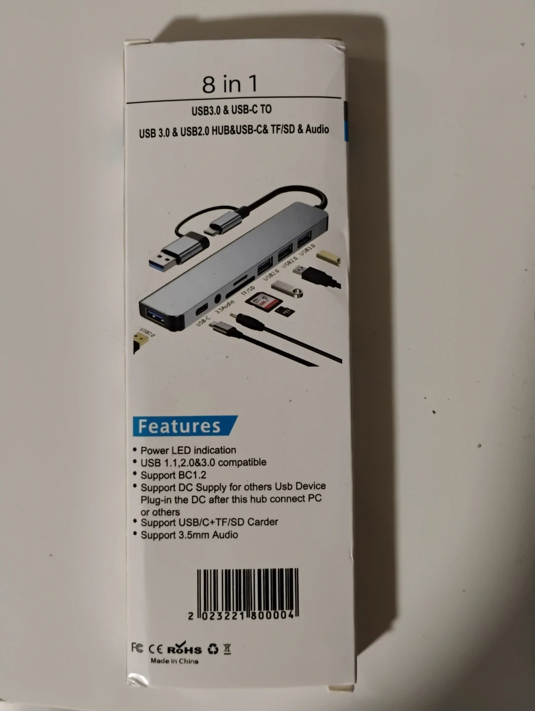 This is an 8-in-1 hub with USB 3.0 and USB-C connectors. It supports USB 1.1, 2.0, and 3.0 devices, and has a TF/SD card reader. It also includes a 3.5mm audio port. Power LED indication is included.