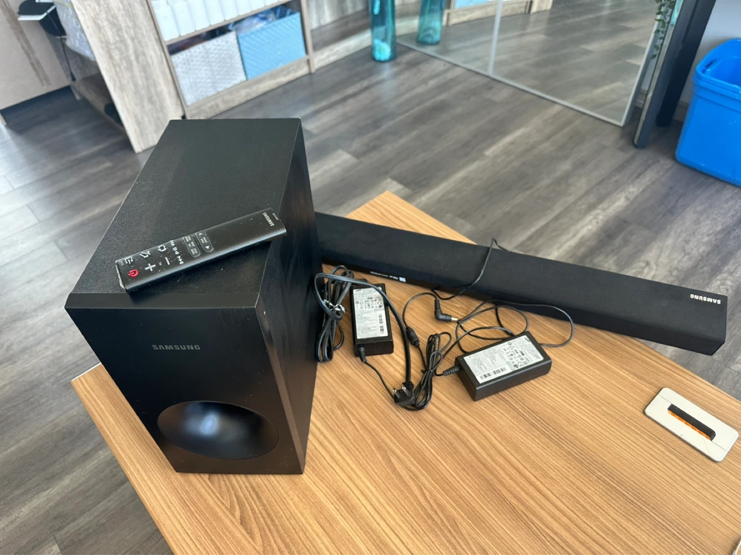 Samsung soundbar and subwoofer system with remote control and power adapters. Features Dolby Audio and DTS 2.0 Channel support. Energy Star certified.