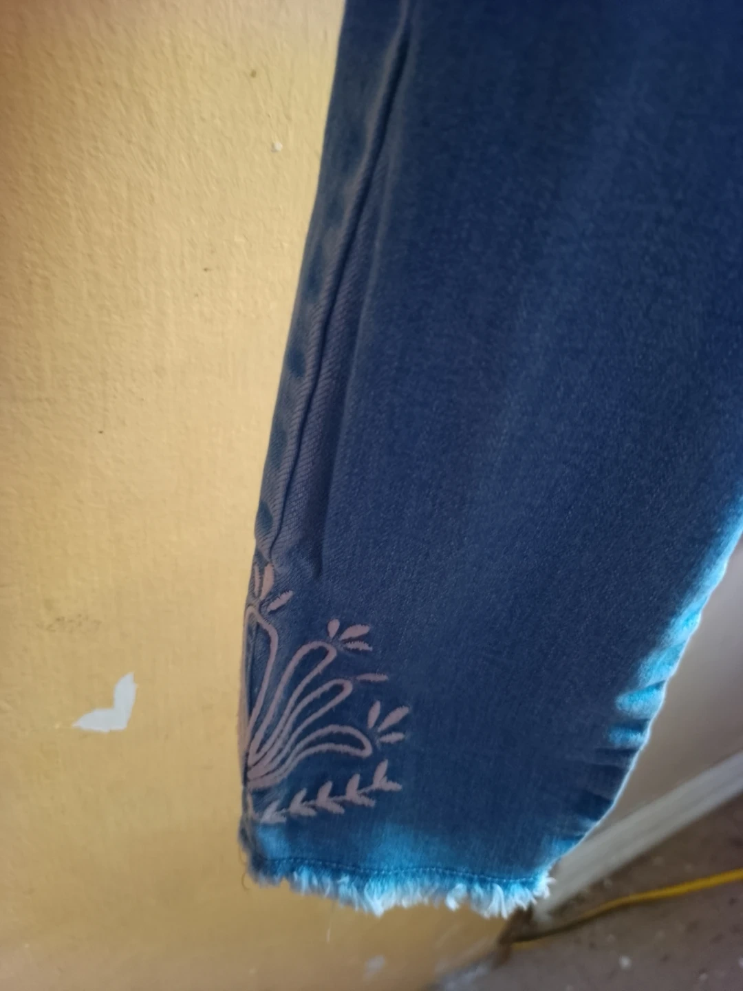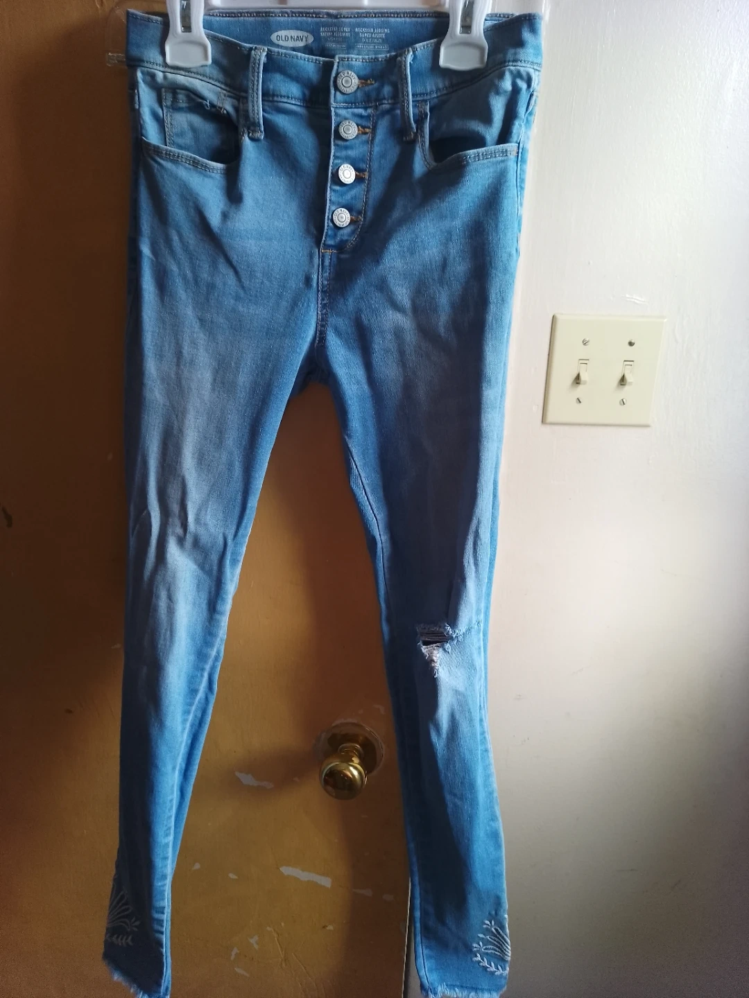 These are Old Navy Rockstar Super Skinny Jegging jeans in a light wash. They feature a high-rise fit and a button-fly closure. Some subtle embroidery is visible on the hem.