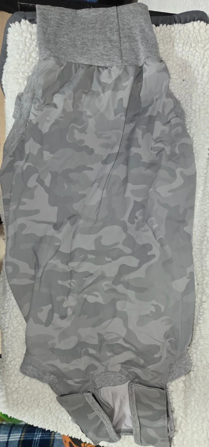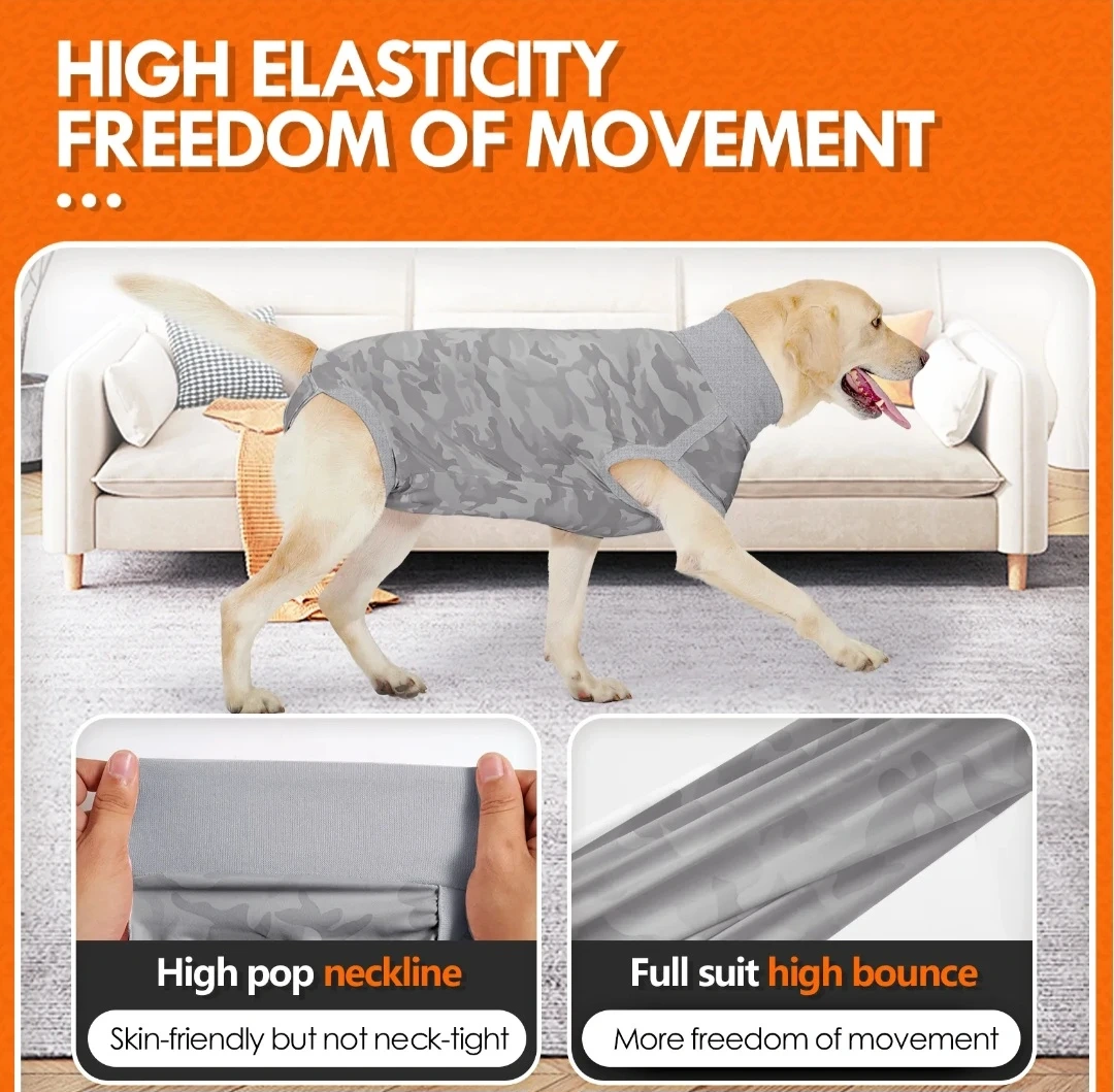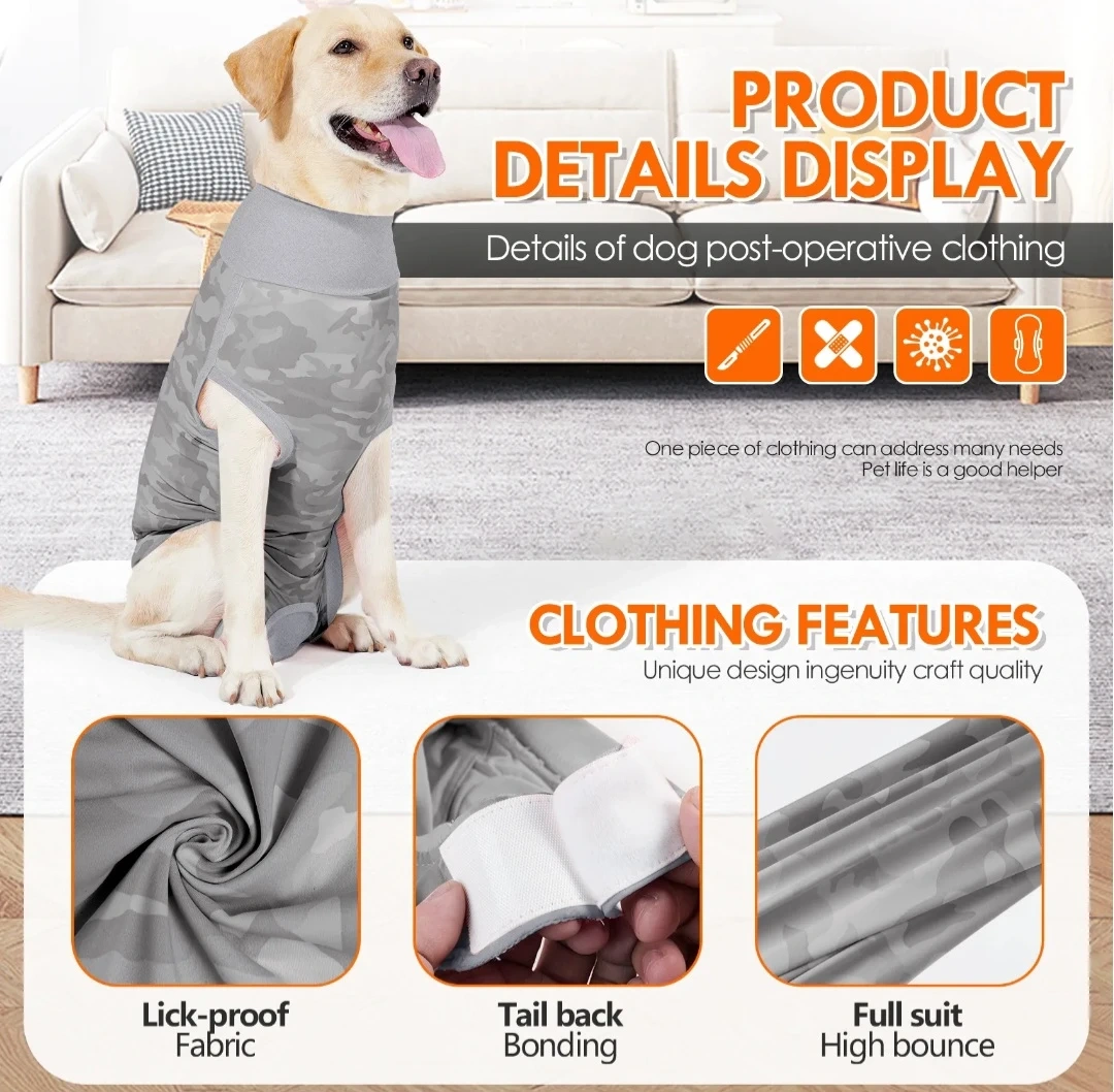 This lick-proof dog recovery suit offers high elasticity for freedom of movement. It features a physiological excretion design and can hold a urine pad. Its design is skin-friendly and offers a full suit high bounce.
