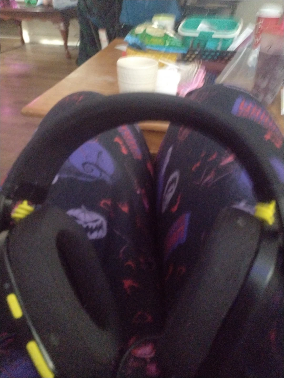 These black gaming headphones feature cool purple accents on the earcups and headband. They offer comfortable ear padding for long gaming sessions. Designed for immersive audio.🥕