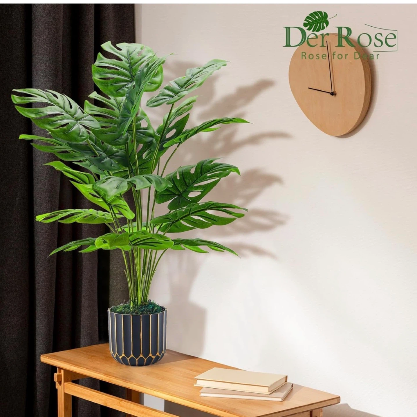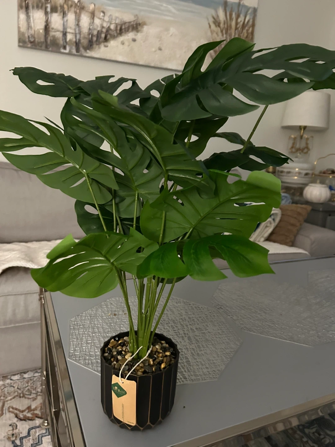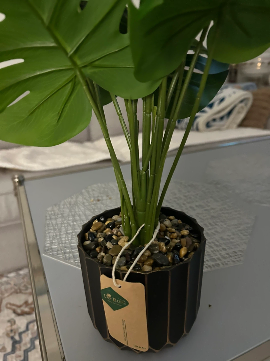 This is a faux Monstera plant, brand Der Rose. It's housed in a stylish black pot with gold accents, filled with decorative stones. This plant adds a touch of greenery to any room without the need for watering or maintenance!