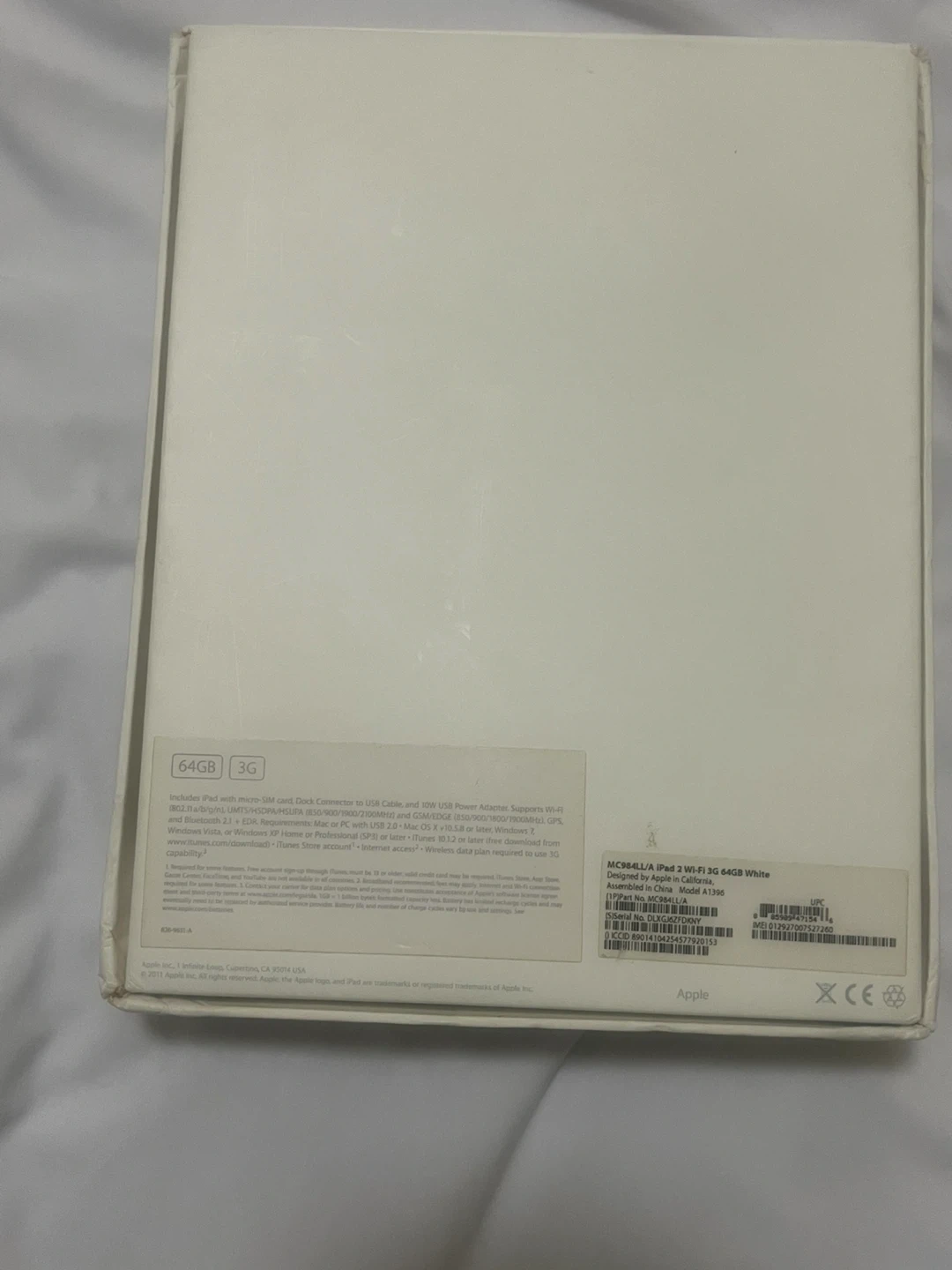 Selling an Apple iPad 2 with 64GB storage and 3G capability. It comes in white and includes the original box. This iPad is ready for a new owner!