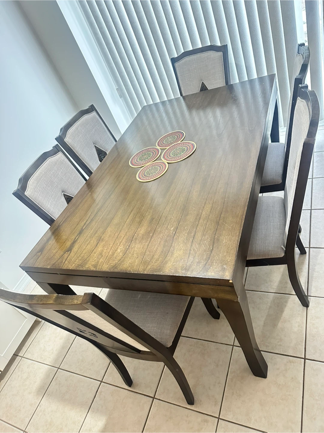 This set includes a wooden dining table and four upholstered chairs. The chairs have grey fabric and dark wood frames. Perfect for family