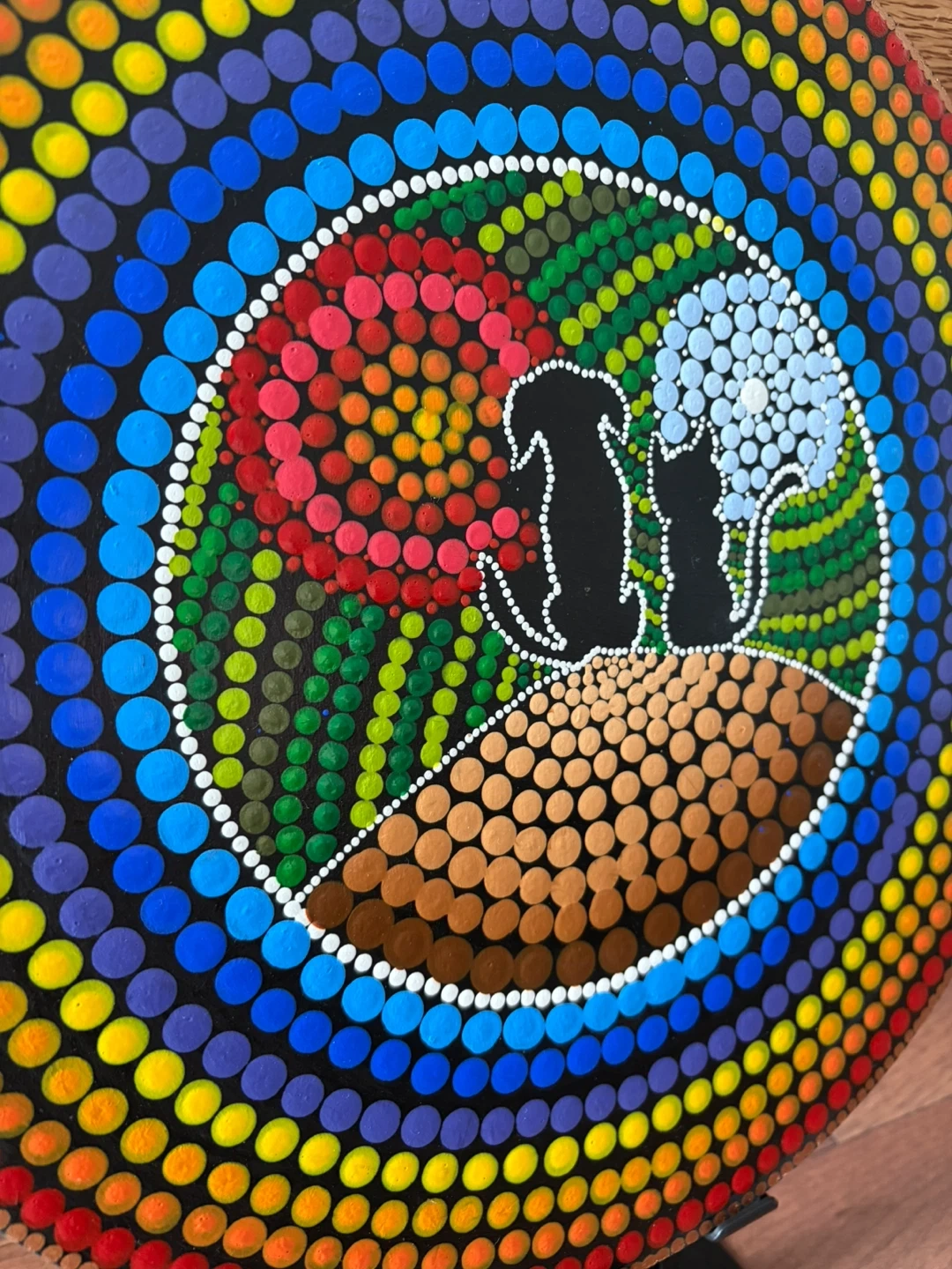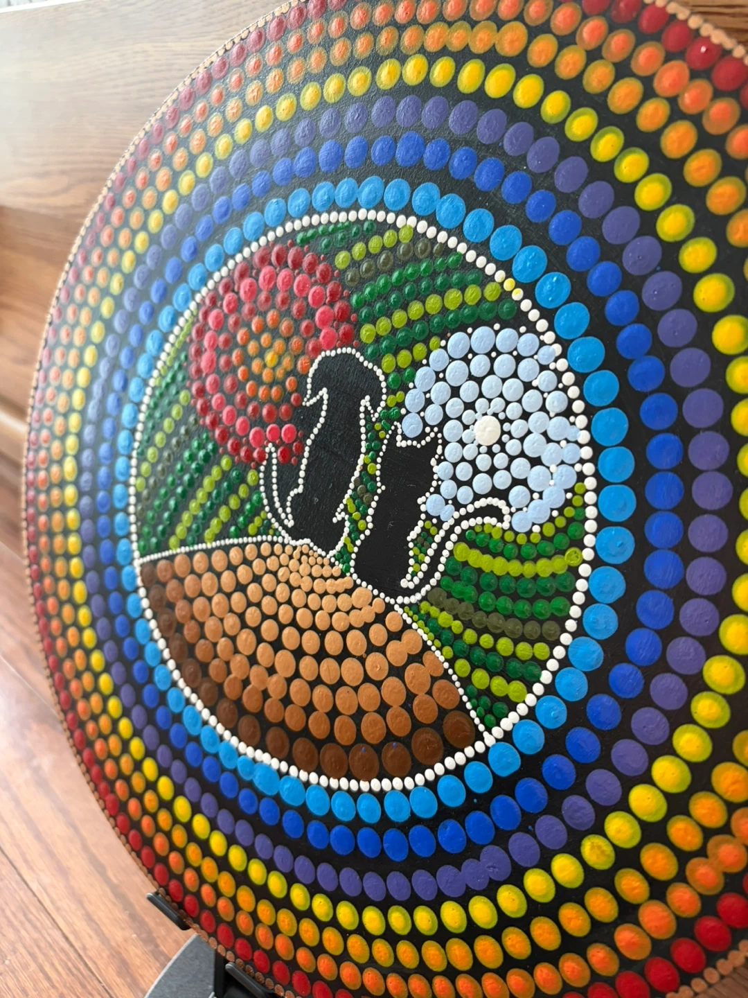 Bring warmth and colour into your home with this one-of-a-kind handmade dot painting featuring two beloved animal silhouettes — a cat and dog — gazing out at a glowing sunset landscape. The scene is beautifully framed by rainbow concentric dot rings in bold reds, blues, greens, yellows, and earth tones, all hand-painted dot by dot.