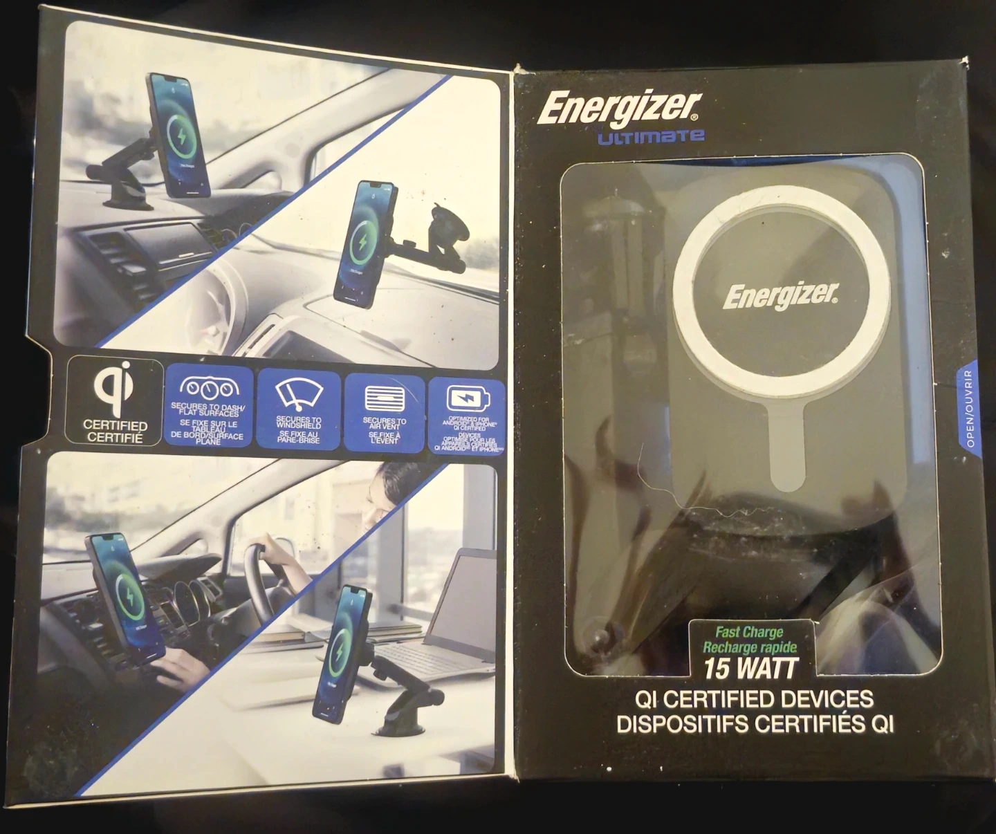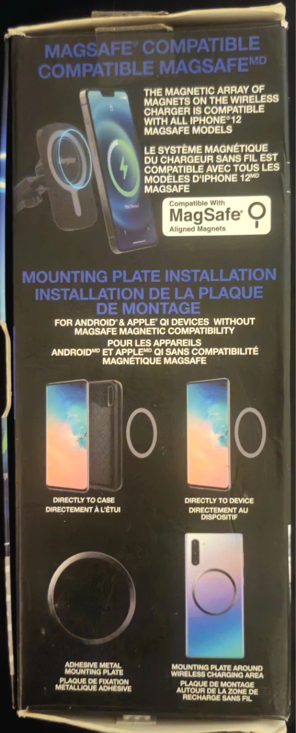 I'm selling a new Energizer Ultimate Wireless Fast Charging Magnetic Mount. This charger is a 15-watt Qi-certified device compatible with MagSafe. It secures to dash, windshield, vent or any flat surface.