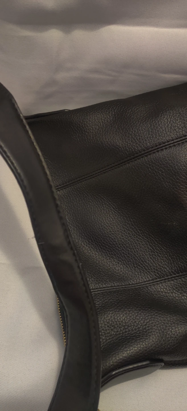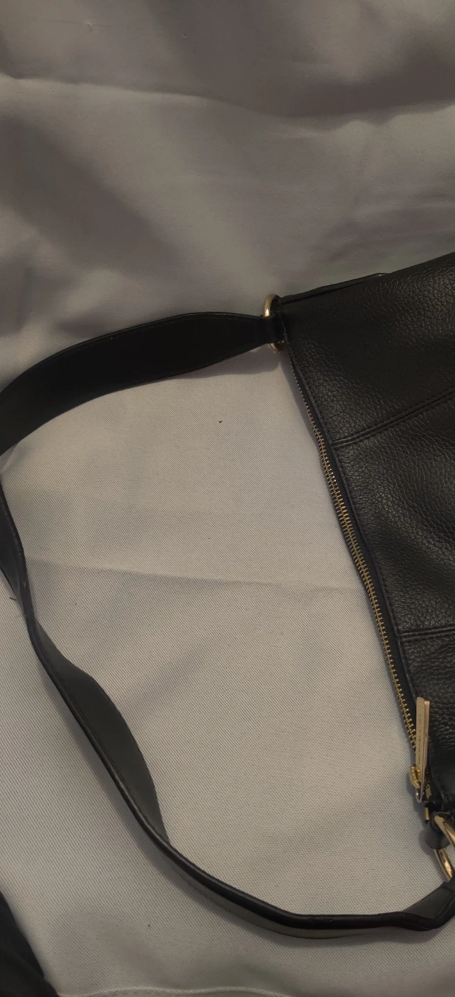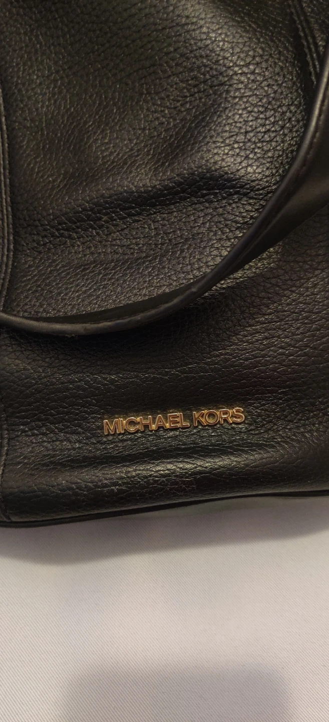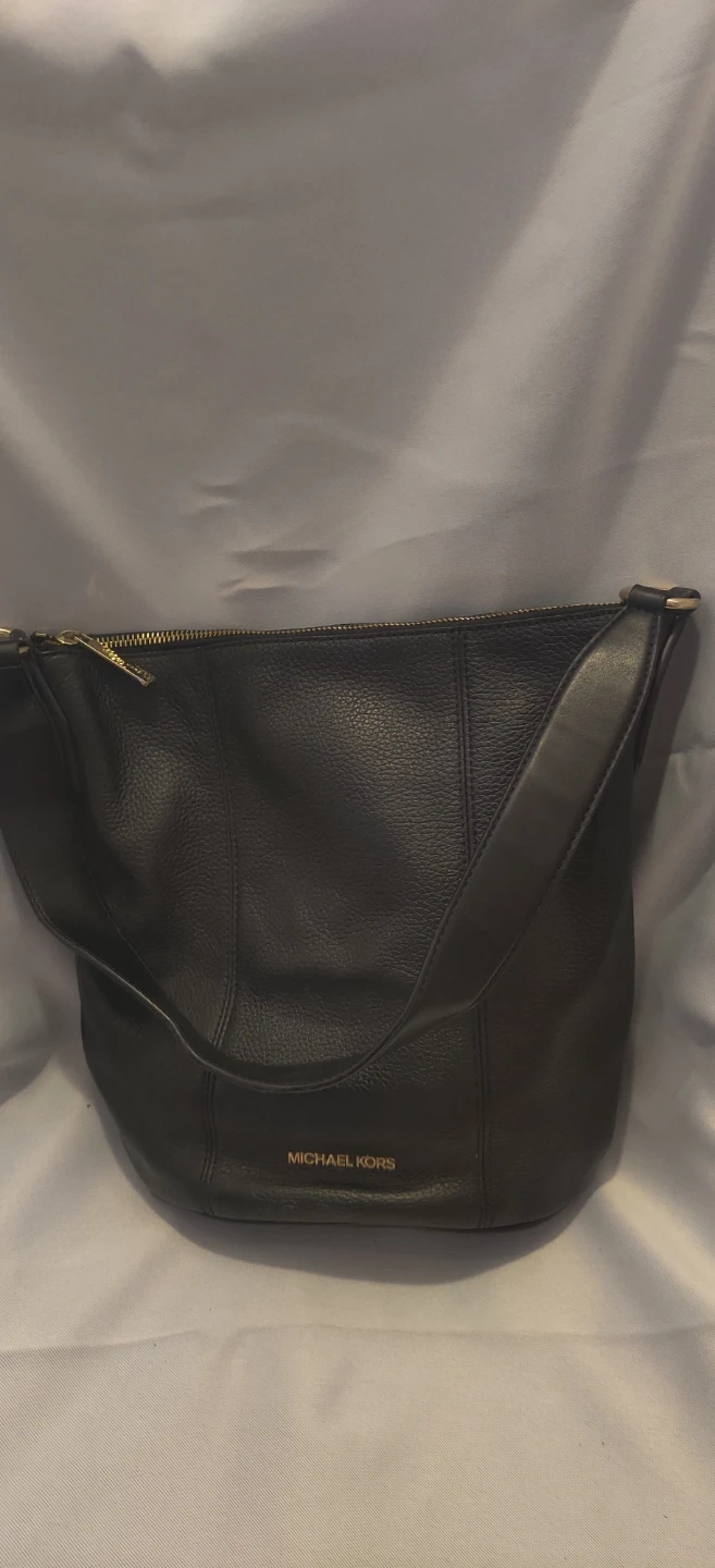 This is a black leather hobo bag by Michael Kors. It's made of genuine leather with gold-tone hardware. Plenty of space inside for all your essentials!