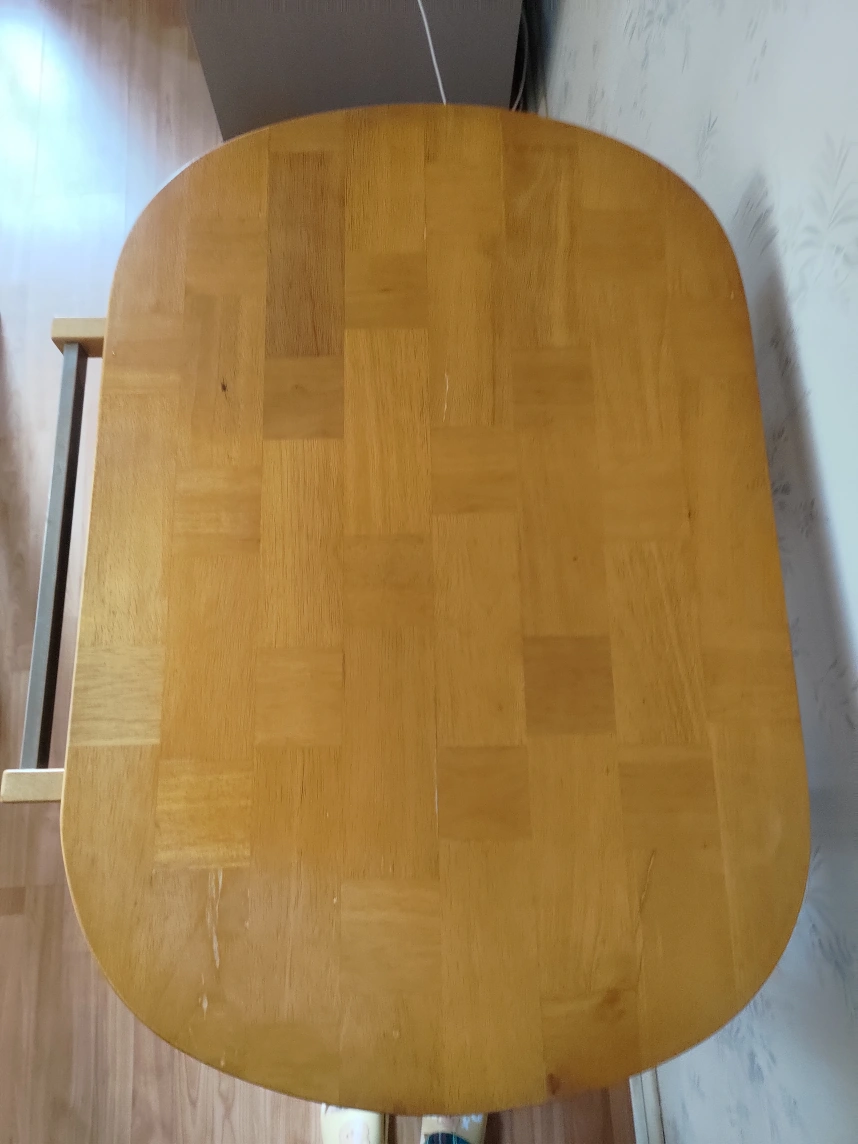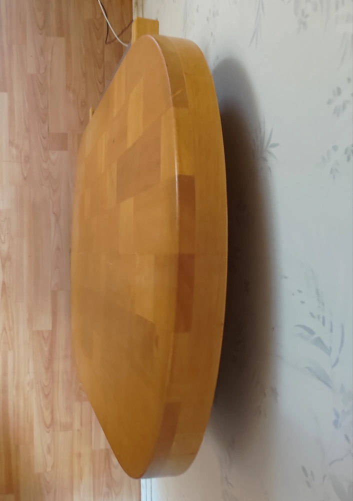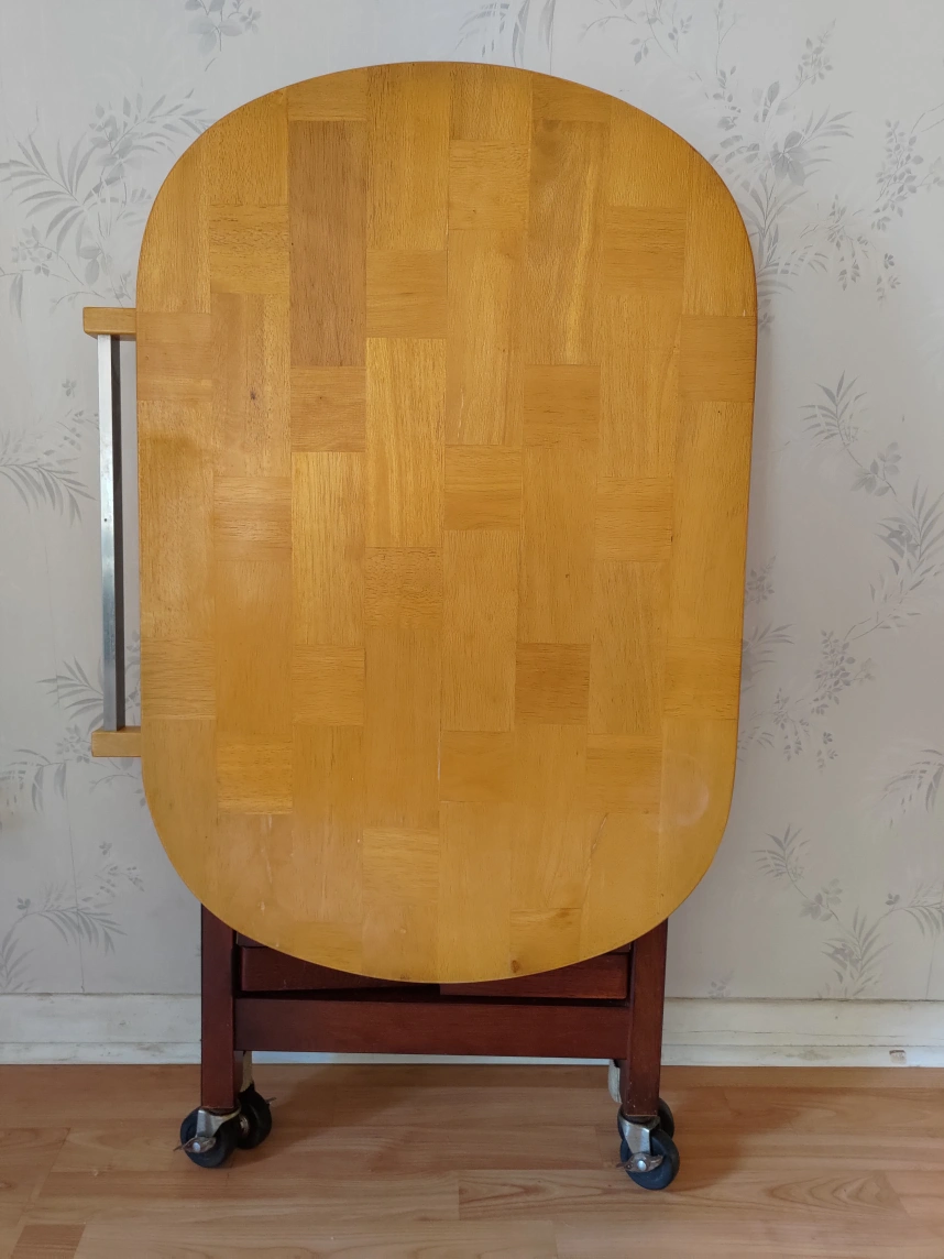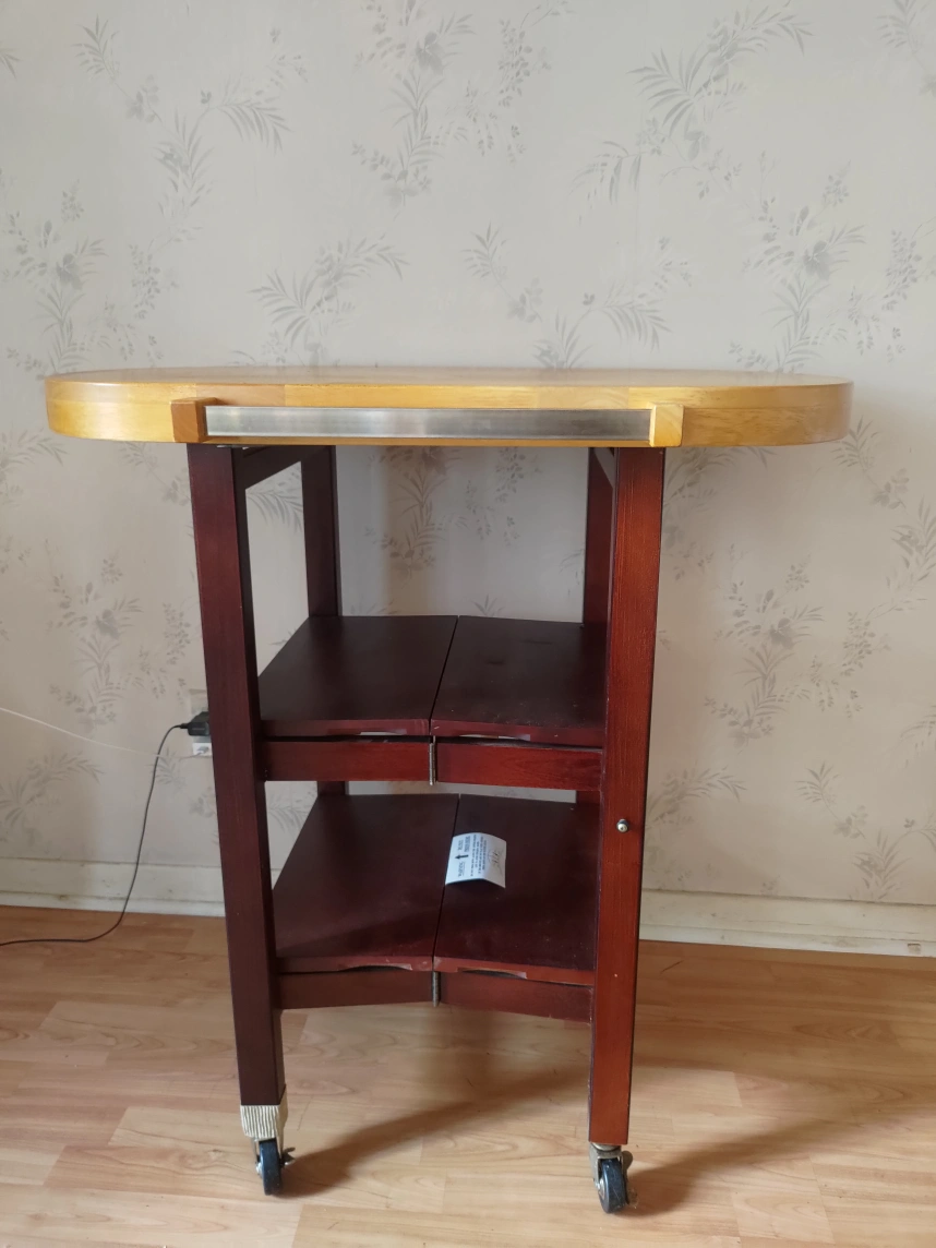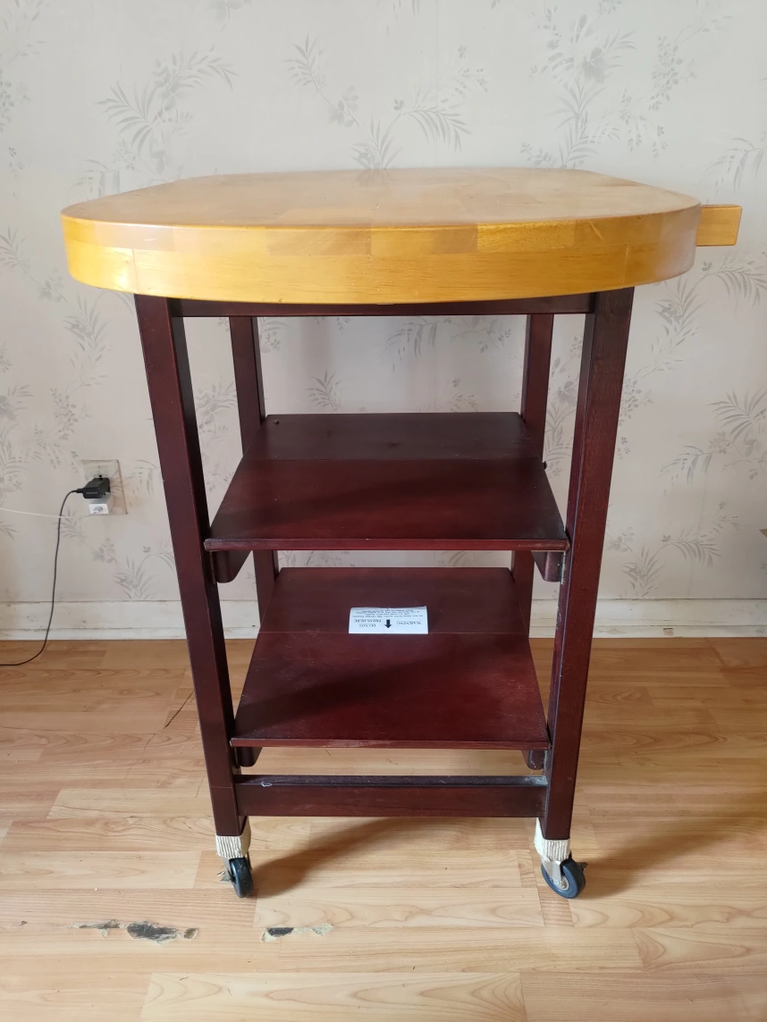 Wooden kitchen island. Features a large oval butcher block top and two lower shelves. Rolls on four caster wheels. Good for extra counter space.Foldable Kitchen Island