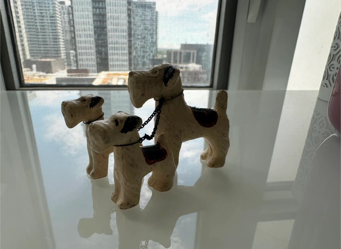 Here's a charming set of three dog figurines, perfect for adding a touch of whimsy to your decor. They're connected by a metal chain leash, giving them a unique character. The dogs appear to be a terrier breed. They're a lovely decorative piece for any dog lover's home!