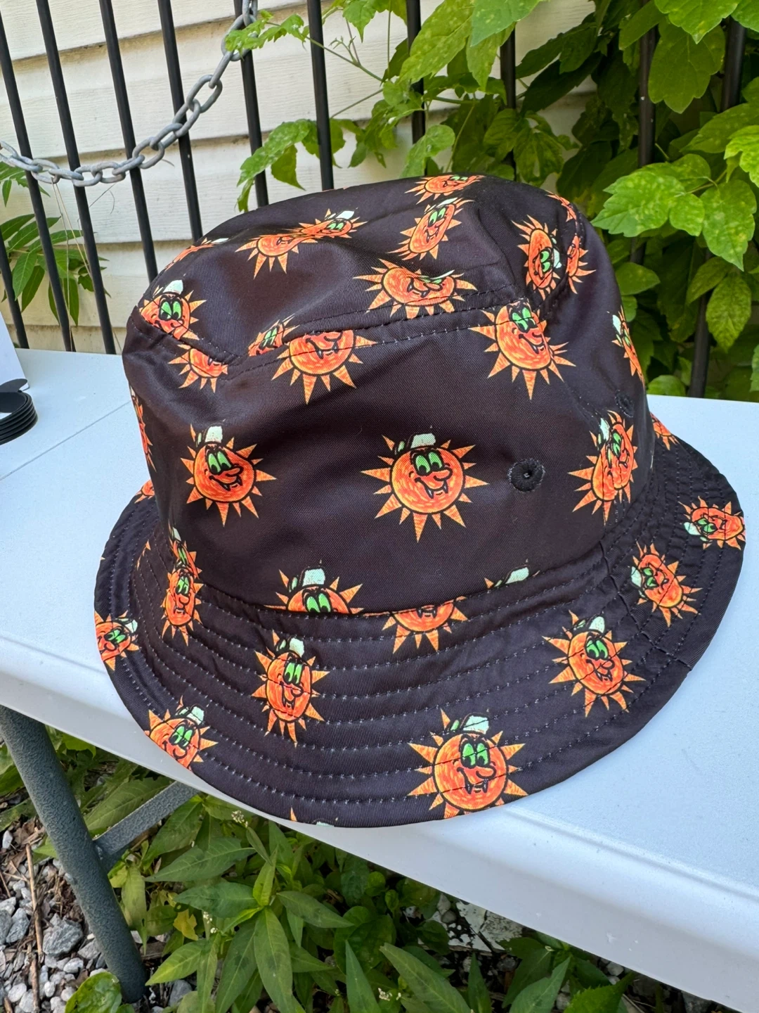 Bucket hat with a fun all-over print of cartoon suns. Black background with orange and green sun graphics. It's made of a smooth fabric. Great for sunny days!