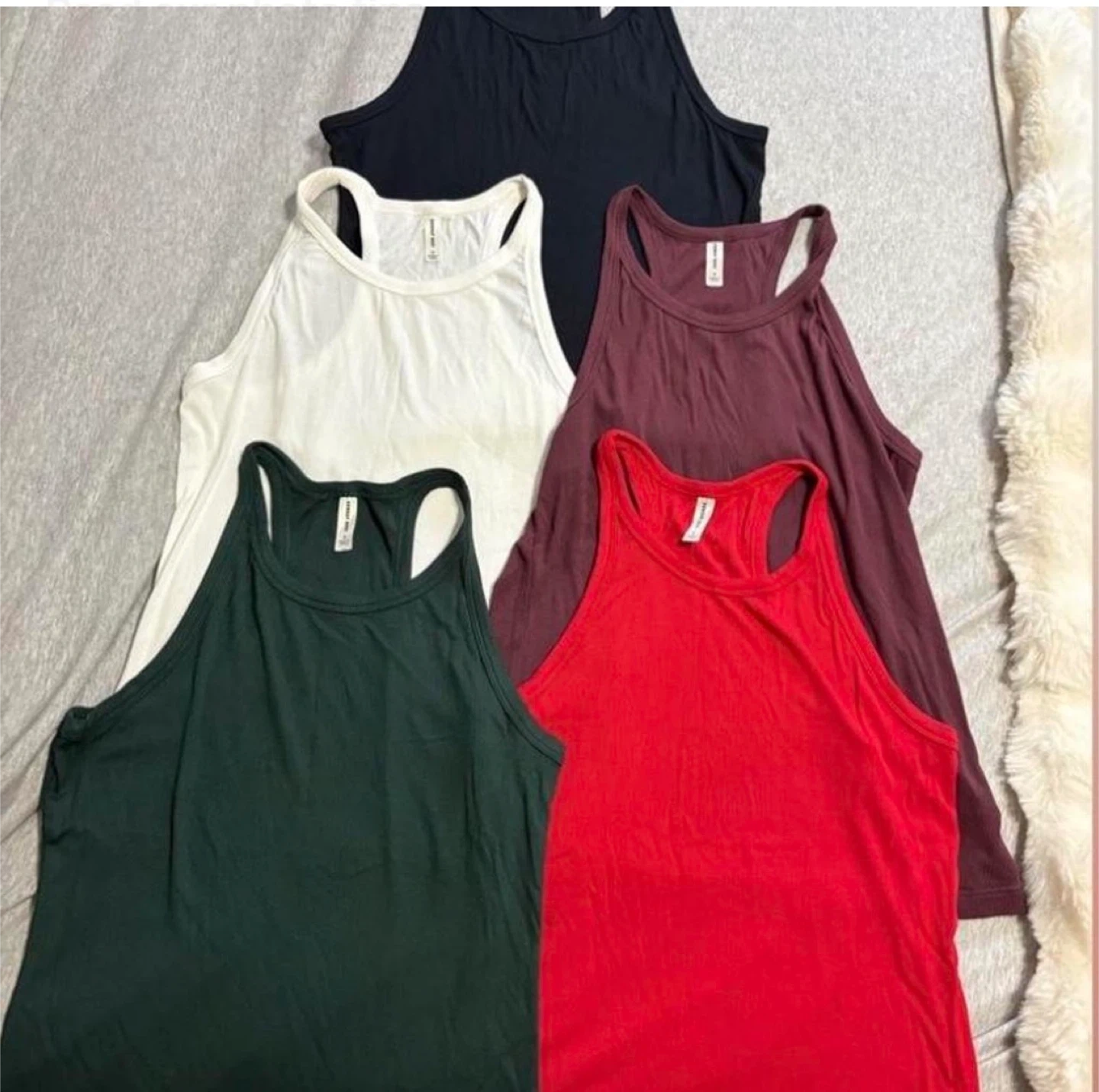 Five ribbed tank tops in assorted colours: black, white, burgundy, dark green, and red. These tanks are made of a soft, stretchy material. They feature a racerback design for comfort and ease of movement.