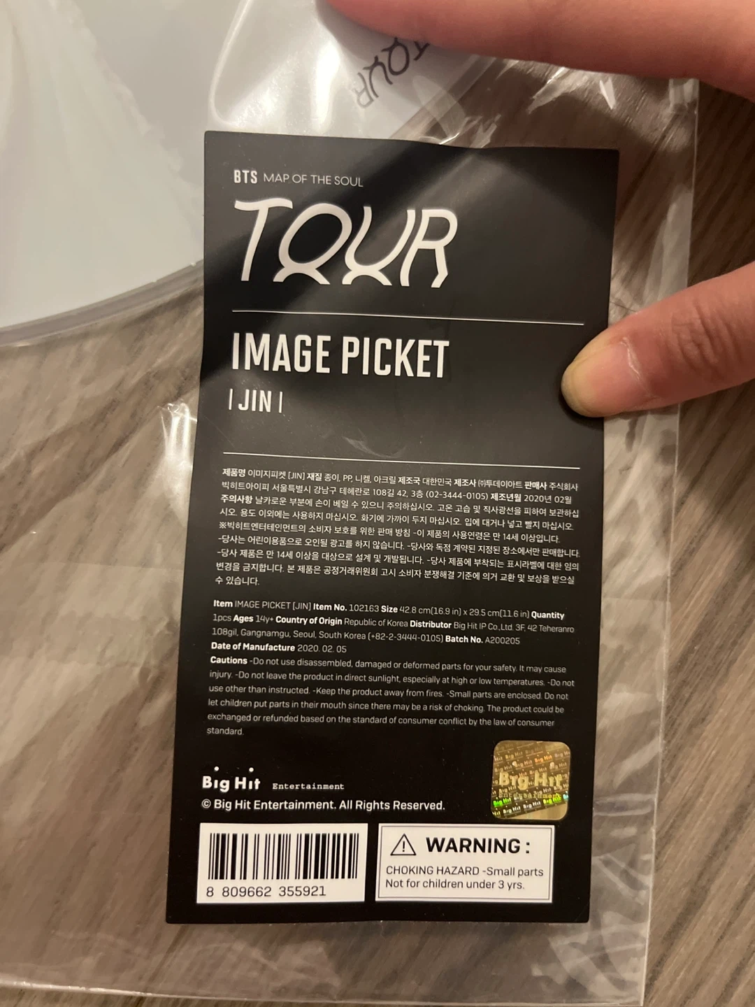 Selling a BTS Jin image picket from the Map of the Soul Tour! It's in its original packaging and in excellent condition. The item number is 102162. It measures 40.8 cm x 29.8 cm x 1.1 cm.