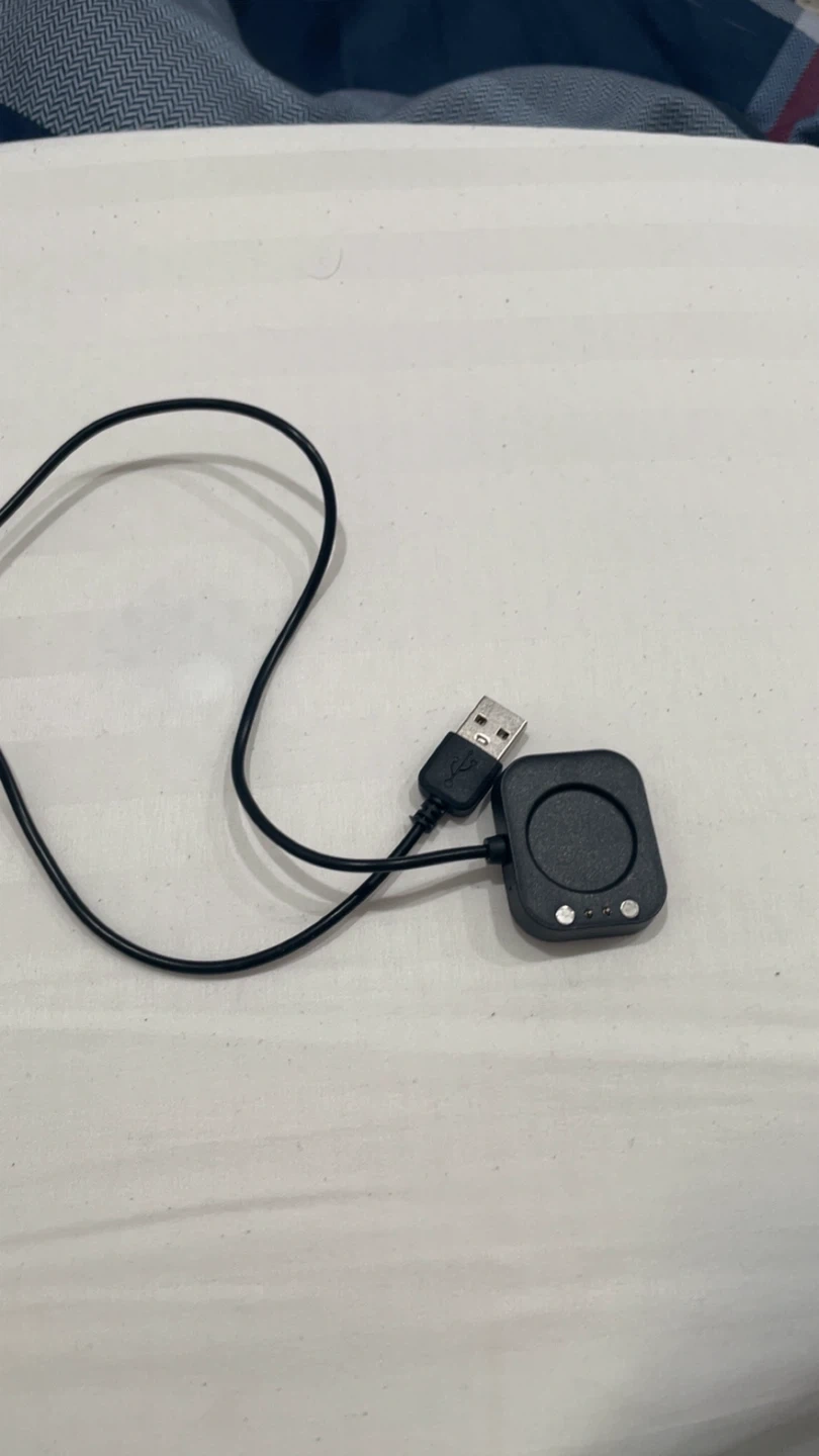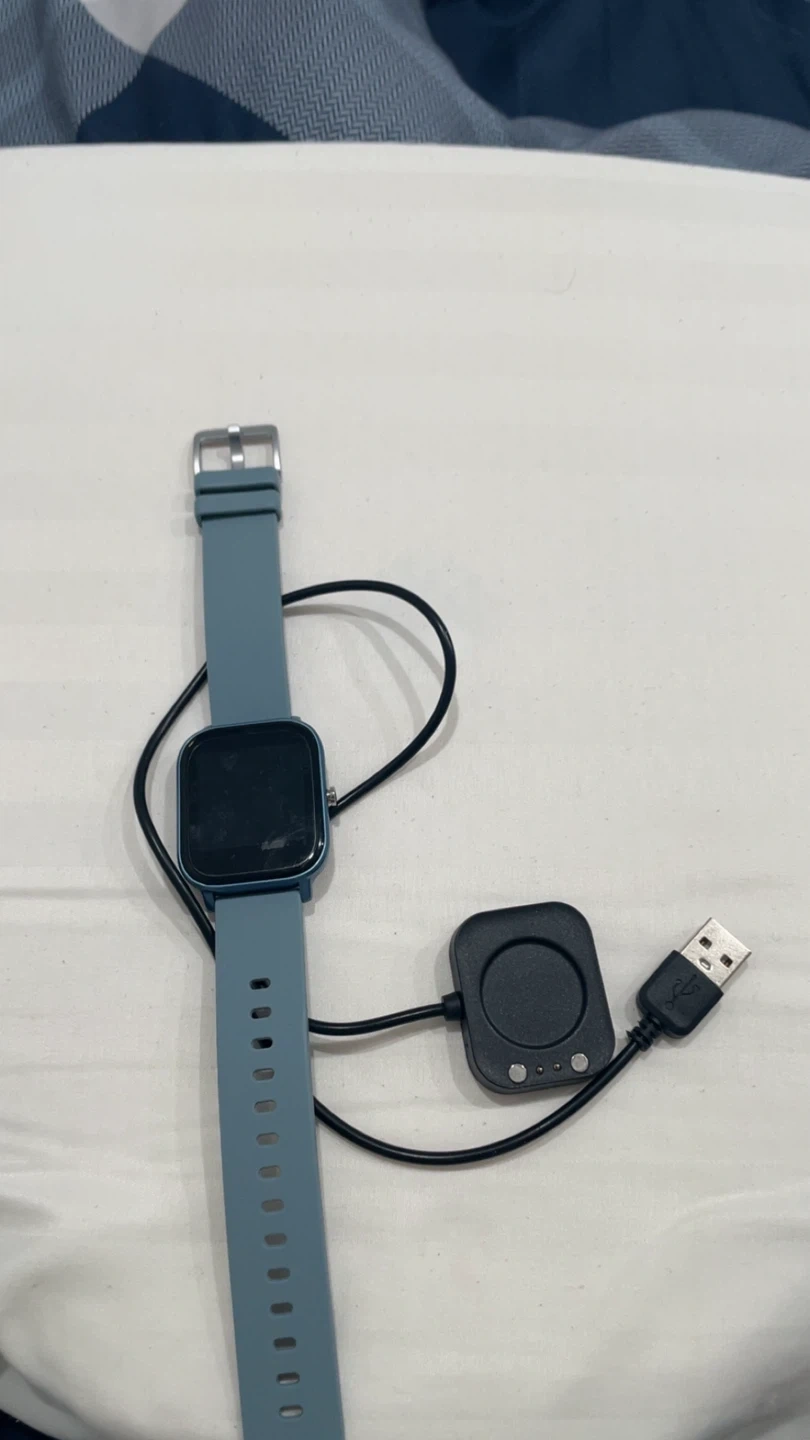 Selling a blue smartwatch that's in good condition! It comes with its charger, so it's ready to go. It's a great little gadget for tracking your steps and staying connected.