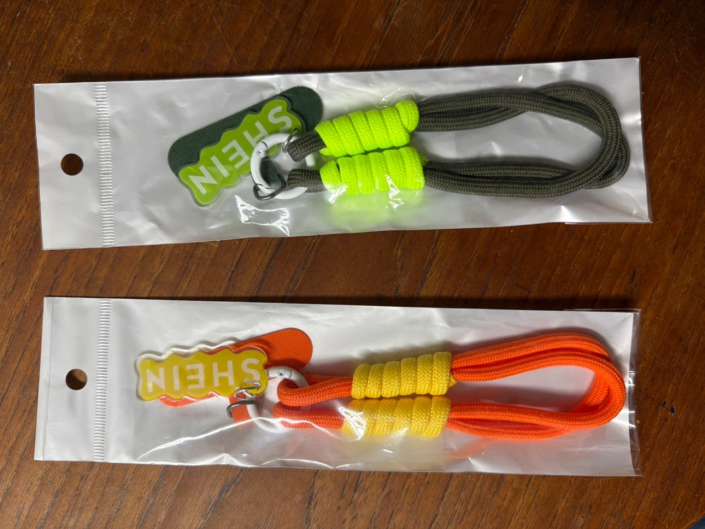 Two colourful lanyards from Shein, one green and grey, the other orange and yellow. They both have a loop for hanging. Perfect for keeping keys or ID handy!