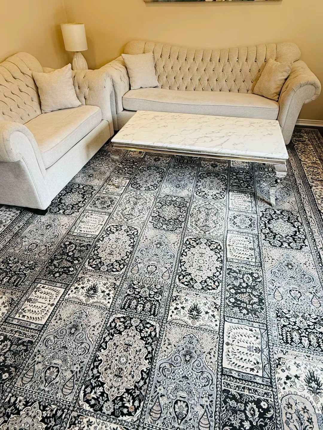 Elegant tufted sofa set in a light beige fabric. It includes a chaise lounge sofa and a matching loveseat. Comes with accent pillows.