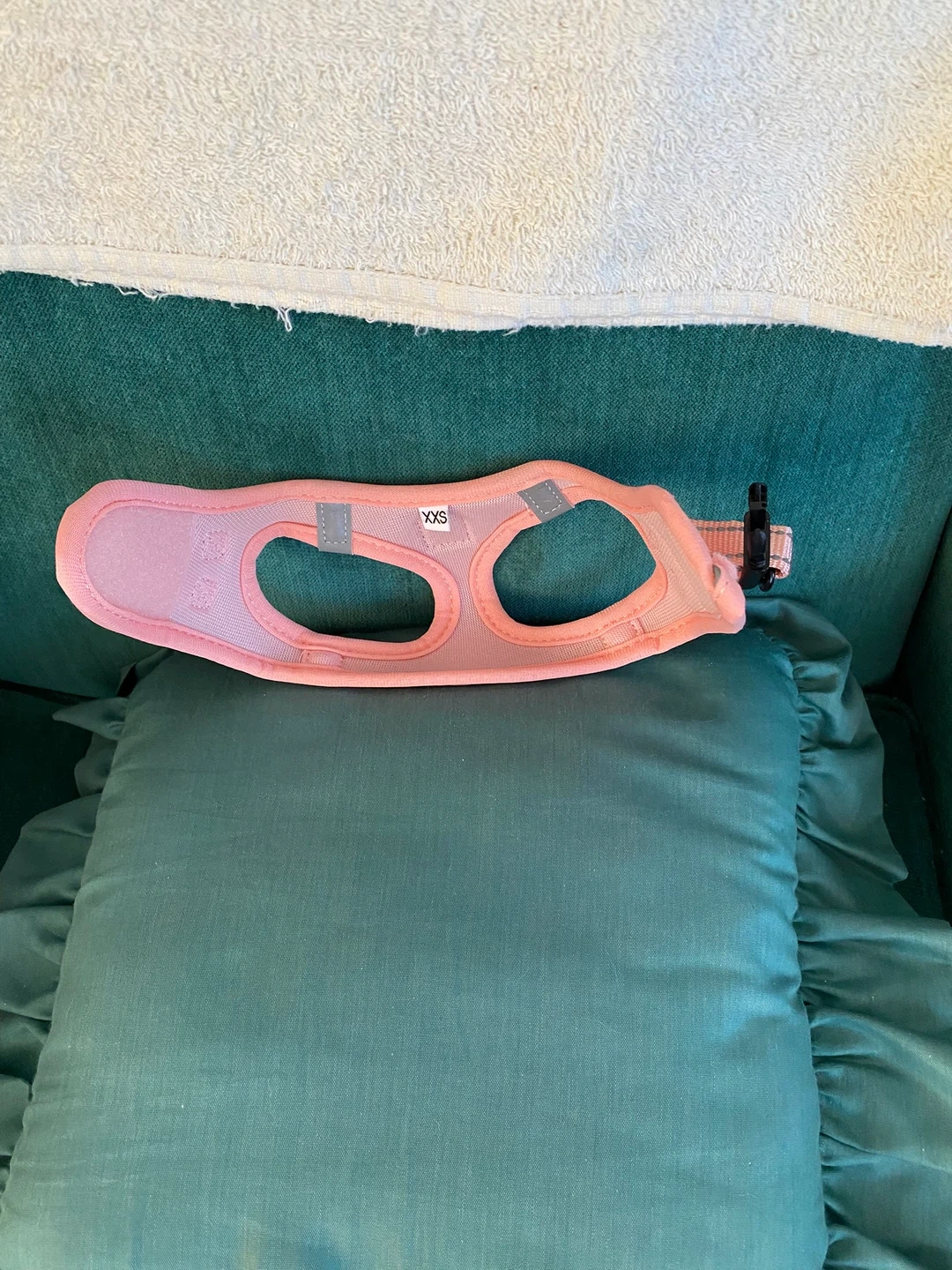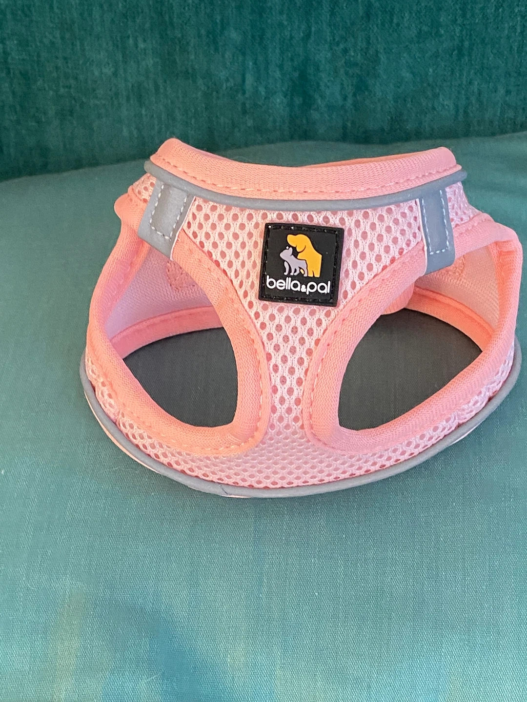This Bella & Pal dog harness is a size XXS. It's made of a pink mesh material with reflective trim. It has adjustable straps and a quick-release buckle.