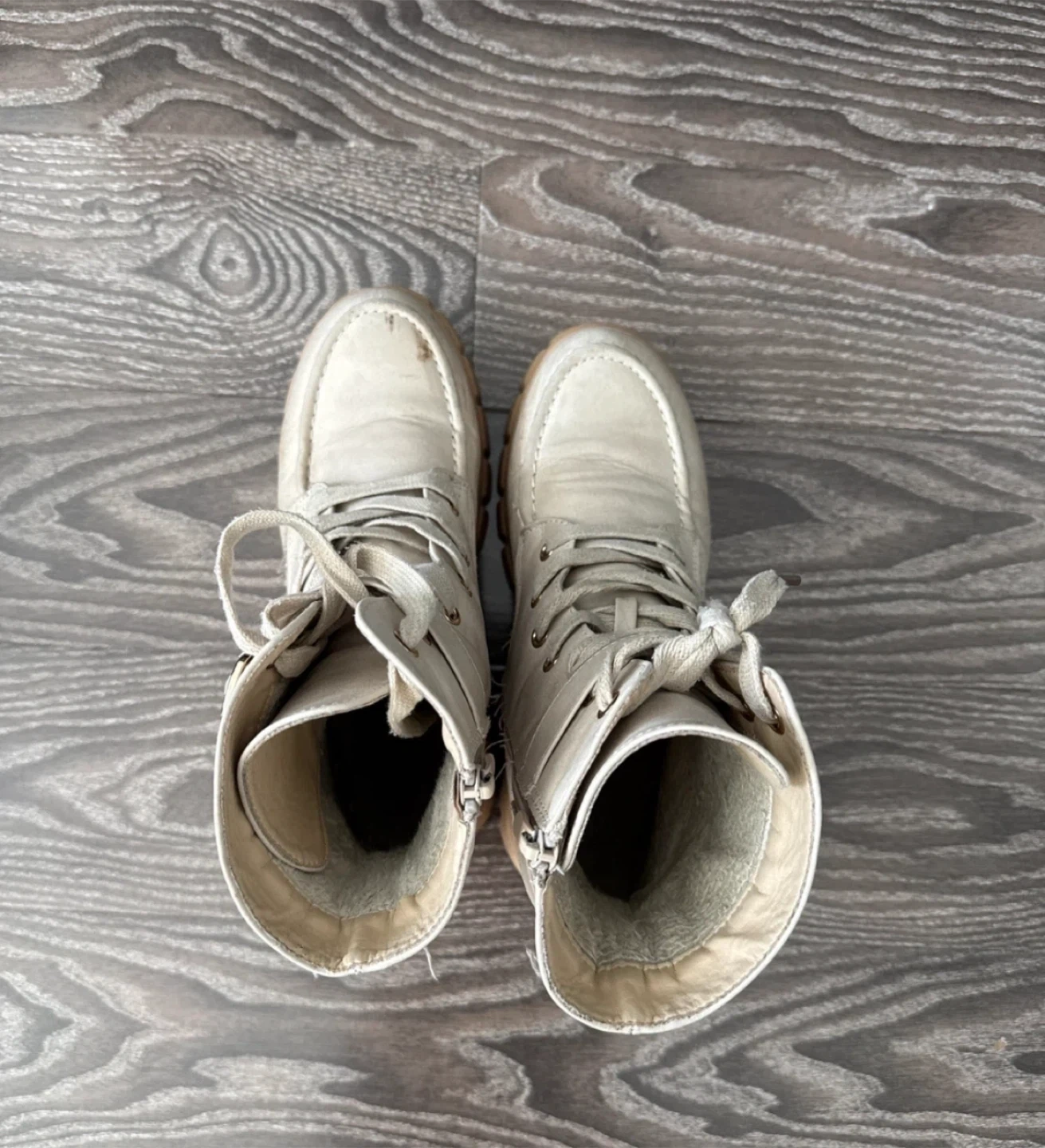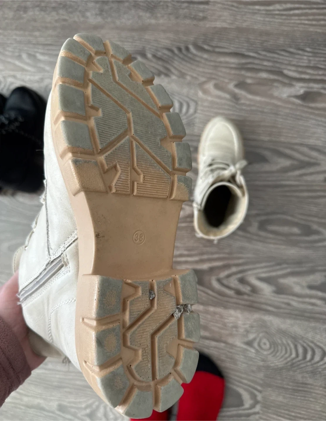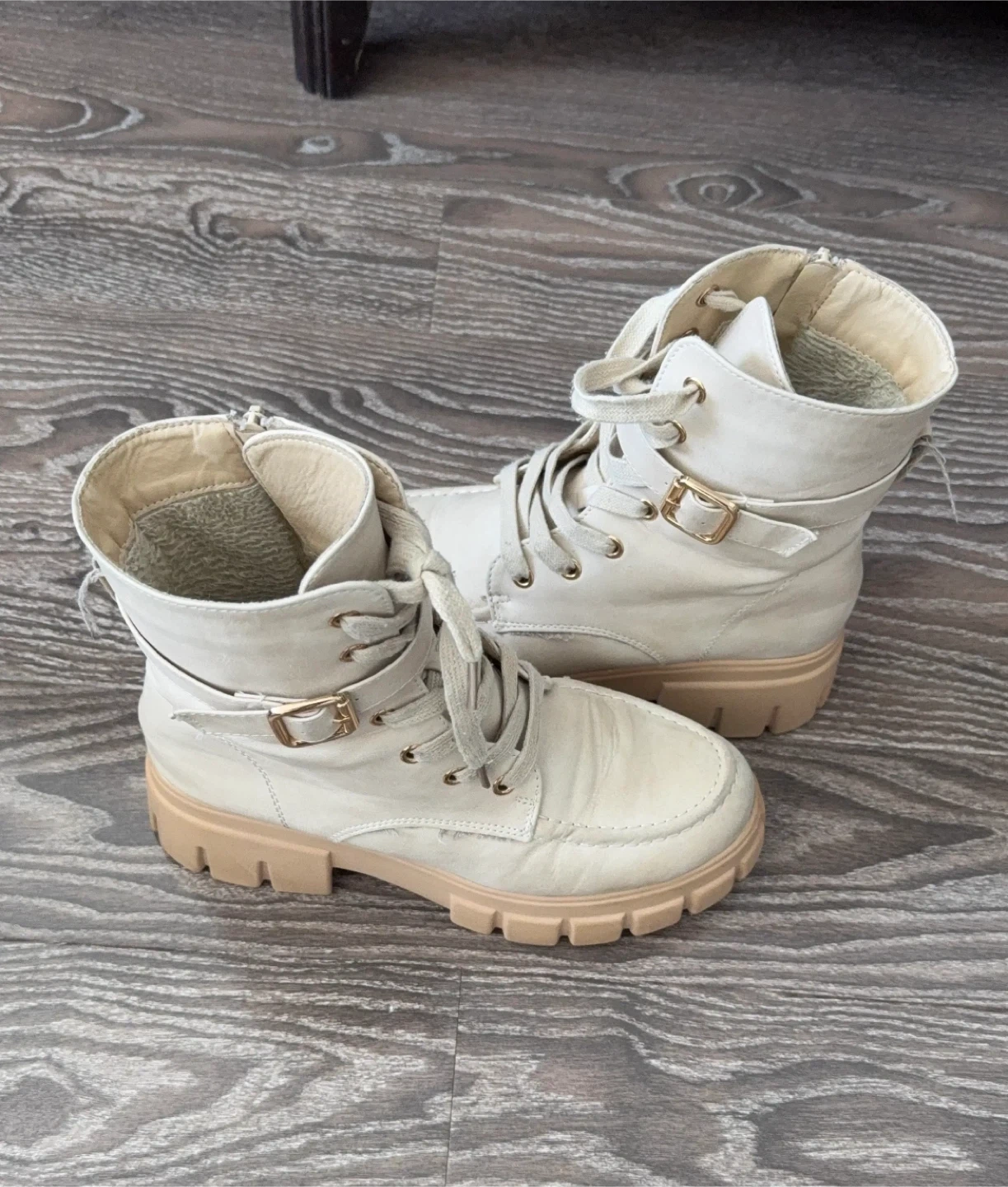 Cream coloured combat boots with lace-up and zip closures. They feature buckle detailing and a lug sole. Size 38./7