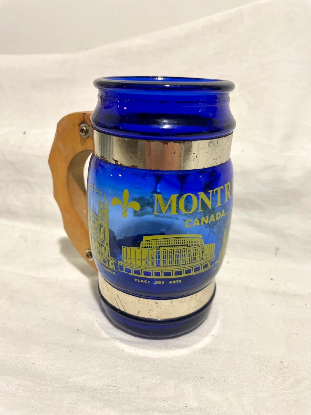 Vintage Blue glass mug / stein with a wooden handle and silver trim. Features a depiction of Montreal landmarks and skyline.