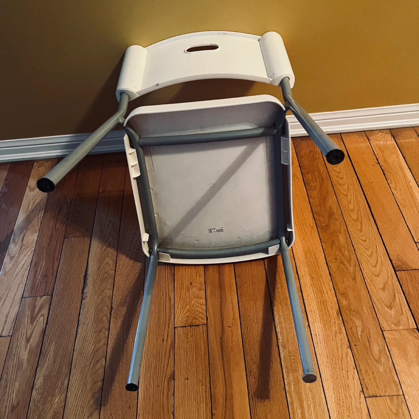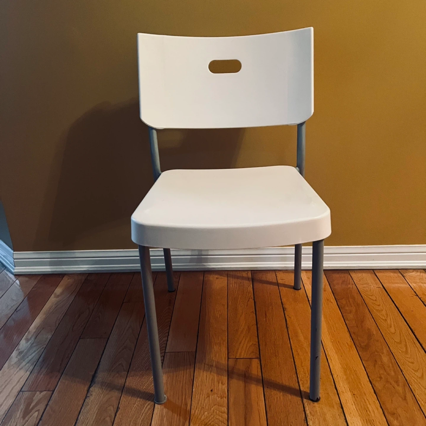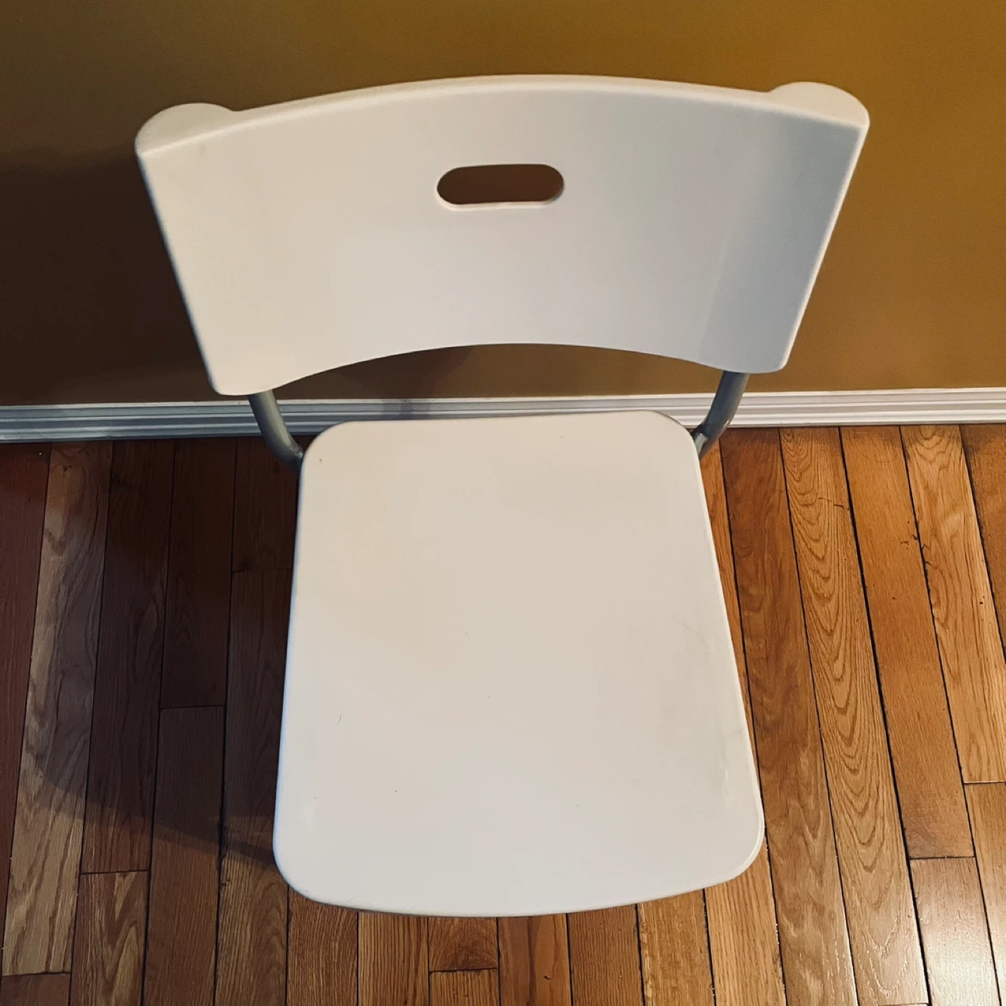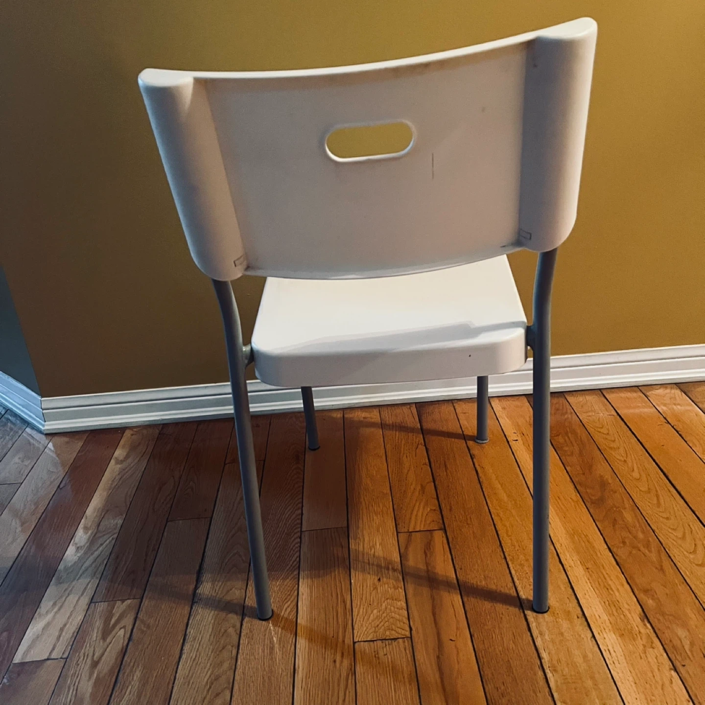 This is a practical white chair with a metal frame. It's lightweight and easy to store. Perfect for extra seating when you need it!