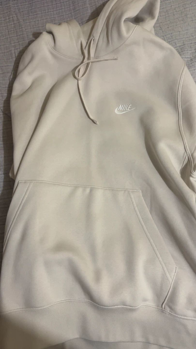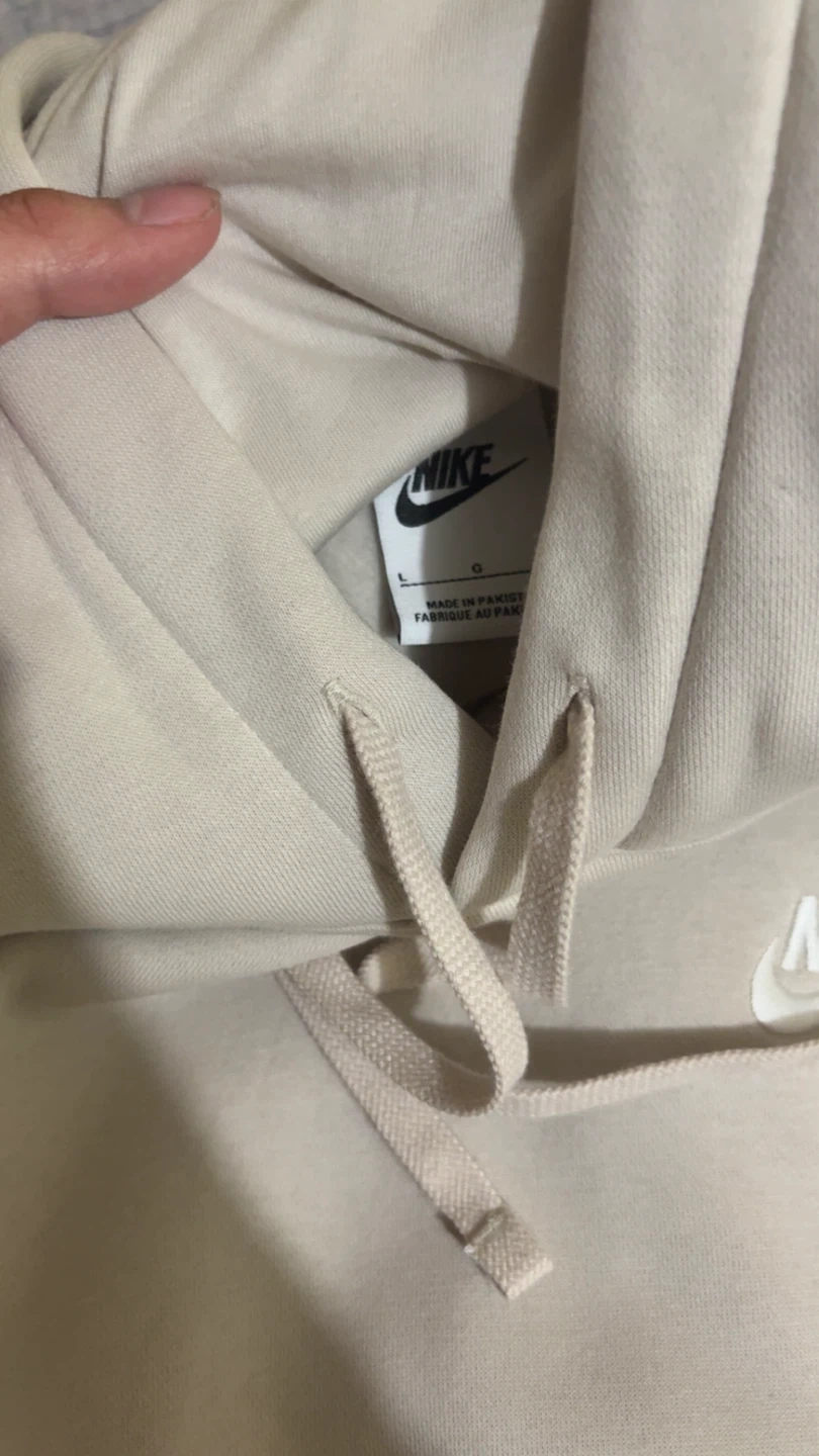 This is a beige Nike hoodie in size L. It's made of a soft, comfortable fabric. Features a front pouch pocket and adjustable drawstring hood. Great for casual wear! Never Worn in Perfect Condition