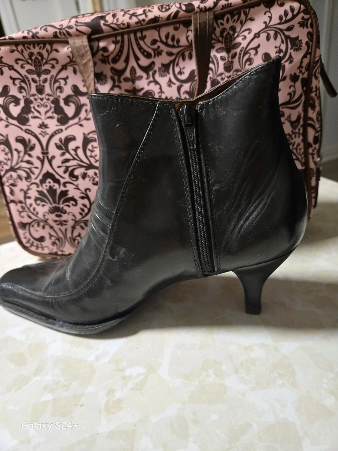 These black ankle boots are made of Napa leather with a Neolite sole. They feature a side zipper for easy wear. Size is 36, heel 5.5 high. Please mo texting before 8aam