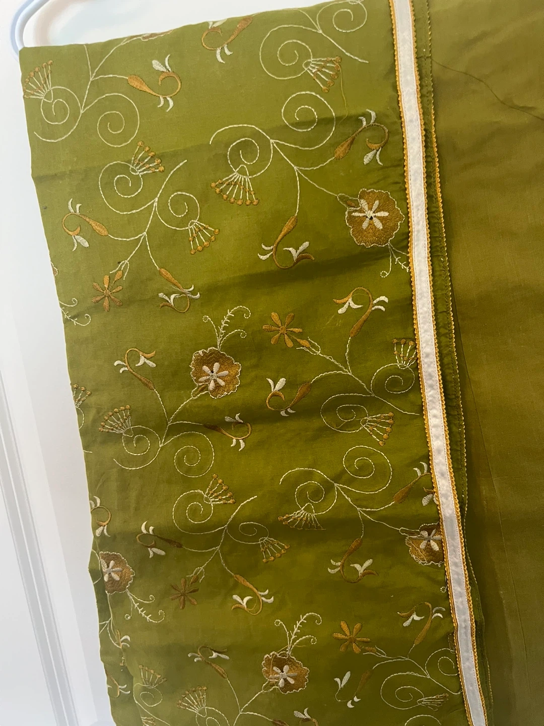 Lovely green kurti with intricate white and gold floral embroidery. Includes matching pants. Great for casual wear!