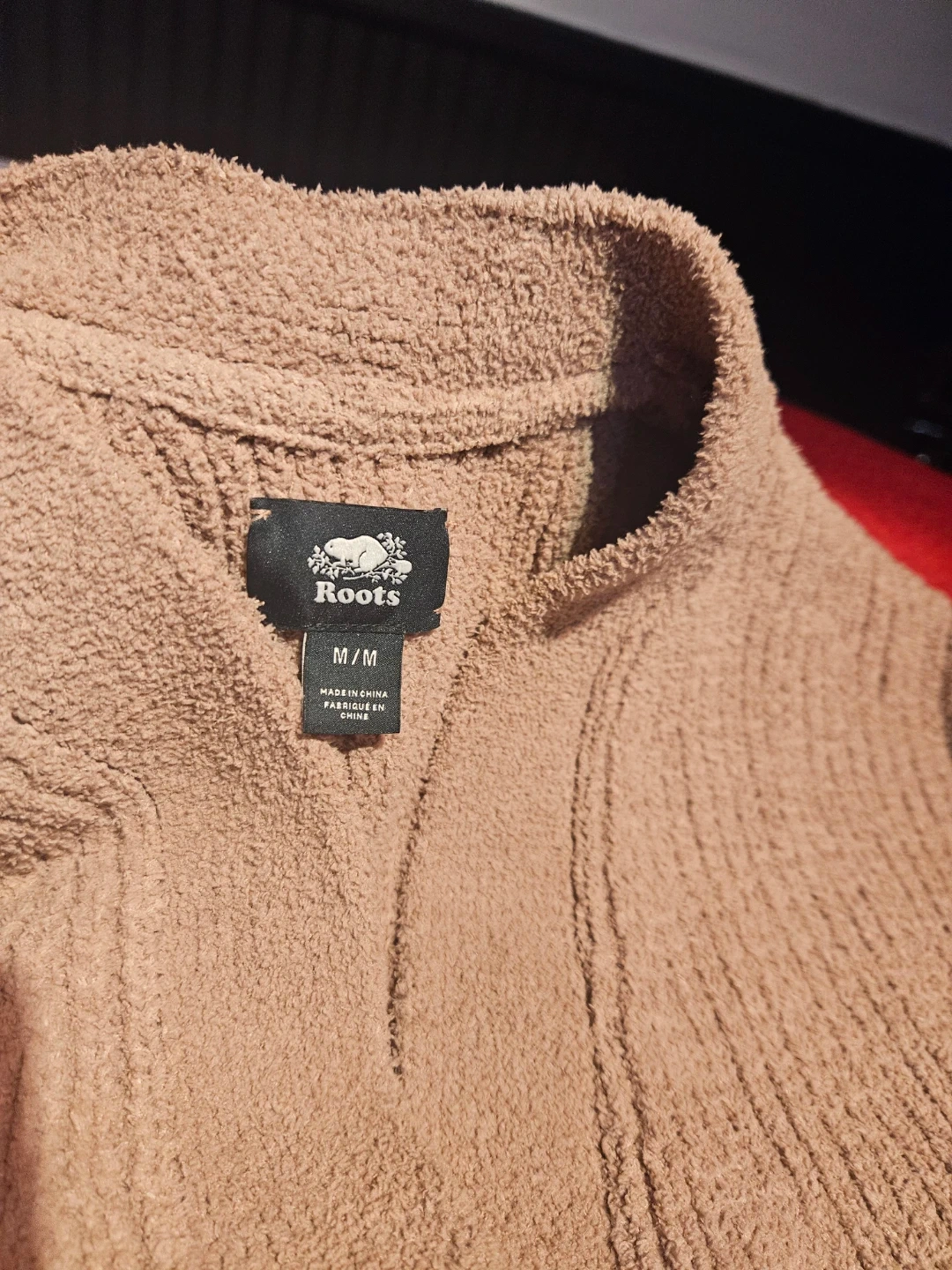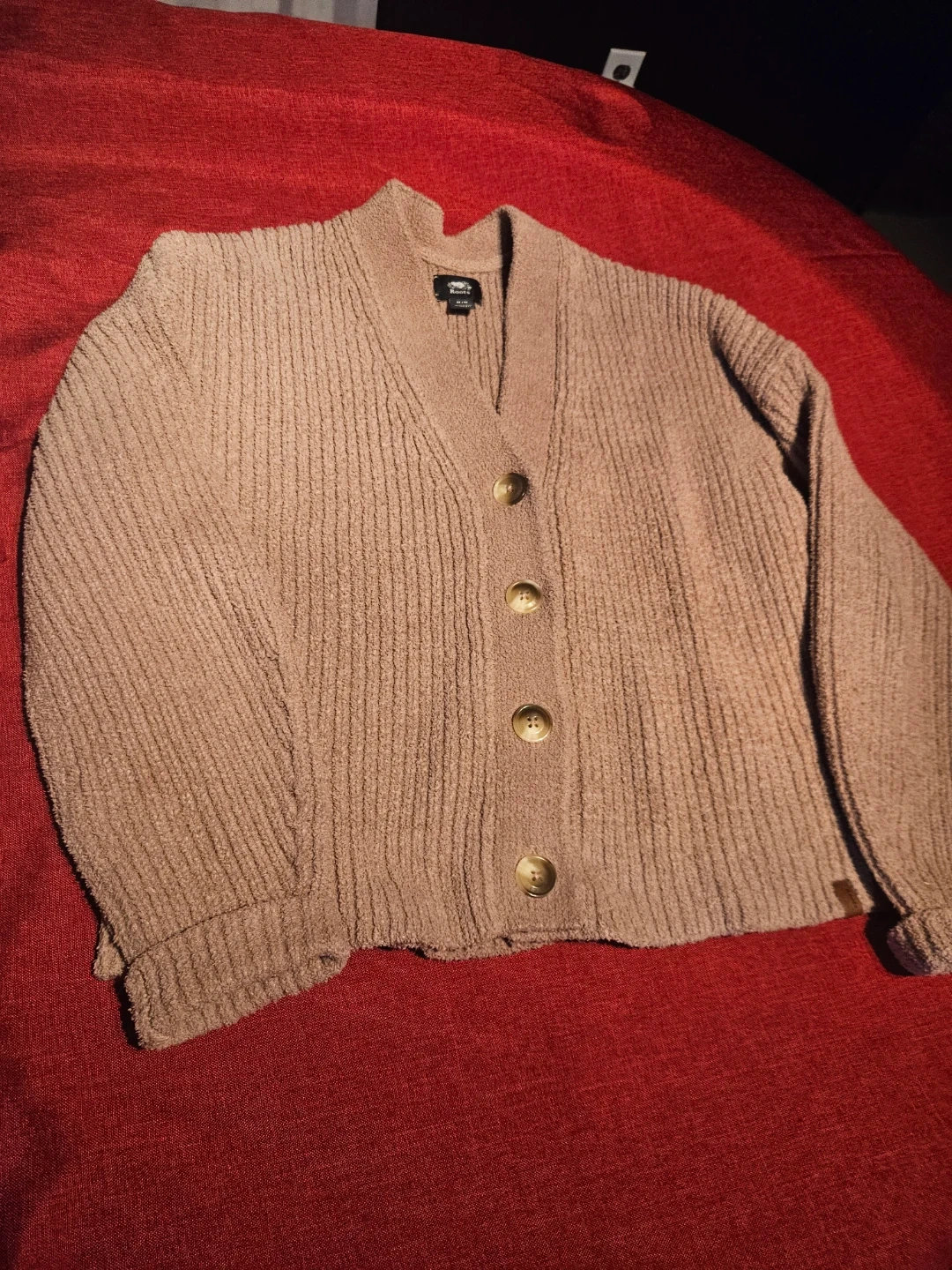 Cozy, fuzzy Roots cardigan in a nice tan colour. It's a size medium, perfect for layering. The knit texture adds a lovely touch!