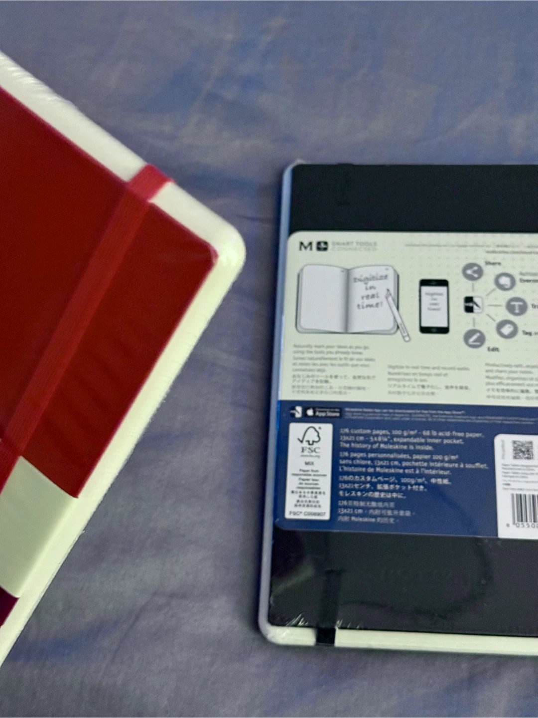Brand new, sealed item. Smart notebook compatible with Moleskine Ellipse pen (sold separately). One red available (ruled): one black (dotted). Both large, 5” x 8.25”