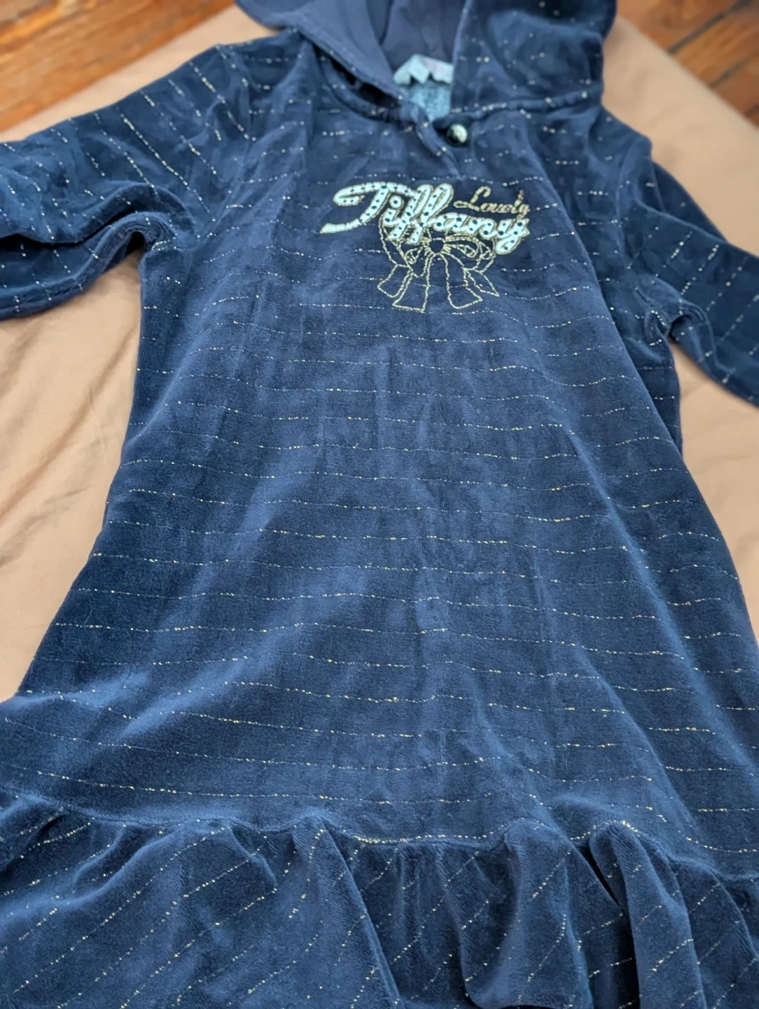 This is a navy velour hoodie for teens. It features gold glitter stripes throughout and a "Tiffi & Lovely" graphic with a bow on the front. A single button closure at the neck. Size 7y